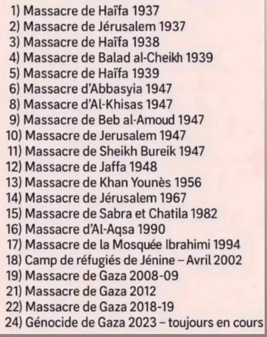 Trouvée sur le net une liste des massacres en Palestine de 1939 à nos jours