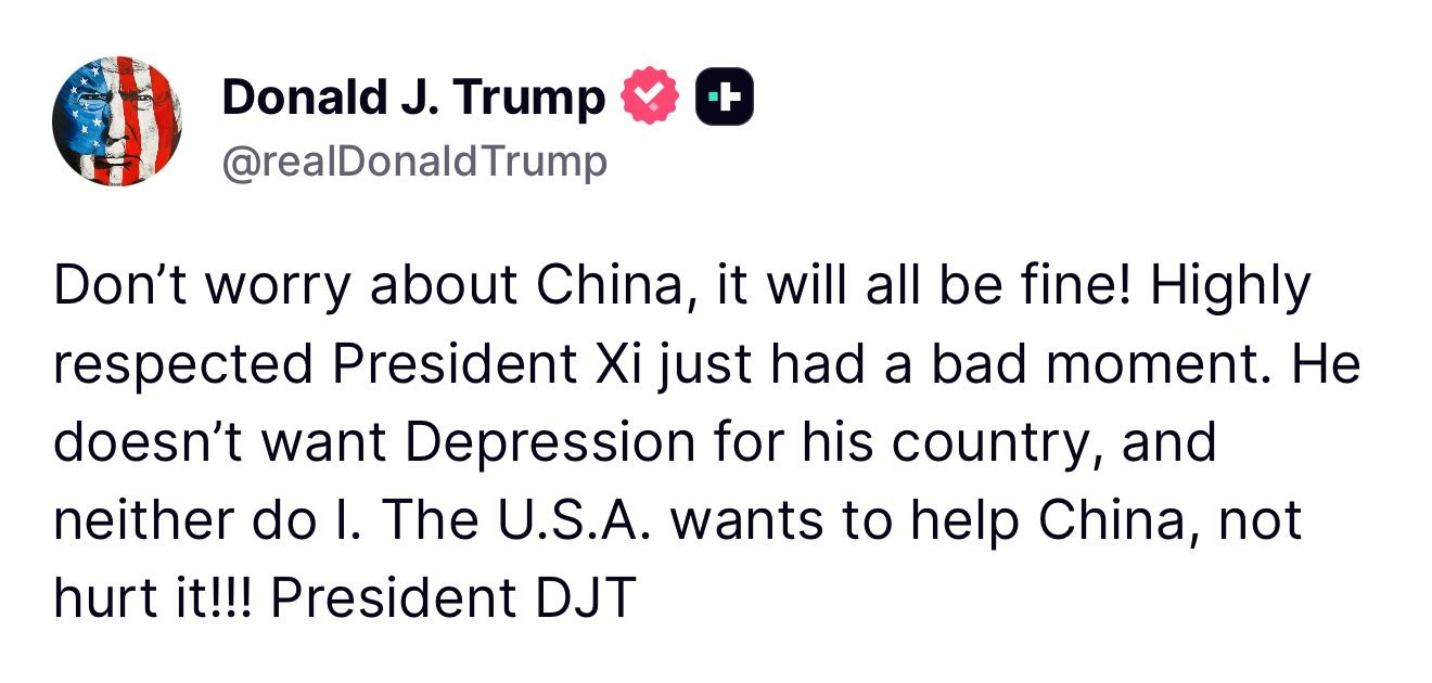 BREAKING: Trump has just said: Don’t worry about China, it will all be fine! Highly respected President Xi just had a bad moment. He doesn’t want Depression for his country, and neither do I. The U.S.A. wants to help China, not hurt it!!!