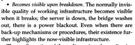 @KathyReid Thanks for posting this. It connects with something I'm doing so I looked it up in Sorting Things Out, where it's part of a page sourced from this paper, which says "Infrastructure emerges with the following dimensions:" embeddedness, transparency, several more, and then this, which I quote for anyone interested.
