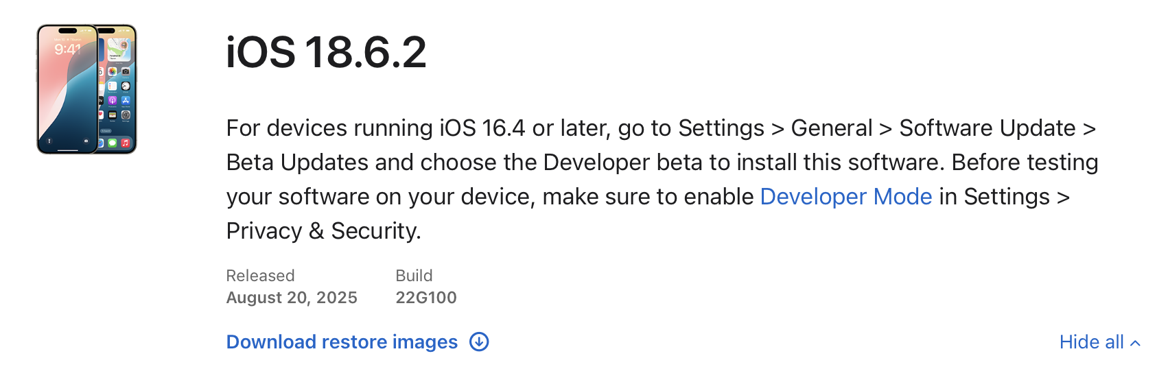 @sensen yup, exactly the same! if you expand the download section, you see they鈥檙e now limited to specific models of devices. There is a window of time when a new iOS version is released when the older version is still available but it was a lot shorter this year and I didn鈥檛 think to get a ipsw file in advance.