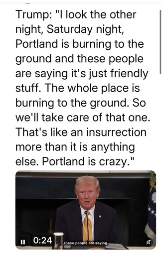 alt Trump: "l look the other night, Saturday night, Portland is burning to the ground and these people are saying it's just friendly stuff. The whole place is burning to the ground. So we'll take care of that one. That's like an insurrection more than it is anything else. Portland is crazy." Trump: "l look the other night, Saturday night, Portland is burning to the ground and these people are saying it's just friendly stuff. The whole place is burning to the ground. So we'll take care of that one. That's like an insurrection more than it is anything else. Portland is crazy."