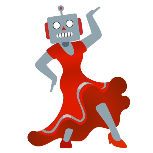 Emoji Kitchen-Sticker der Emojis 🤖 und 👠 Heraus kommt ein schlanker tanzender Körper in einem roten kleid mit dem Roboter Emoji als kopf