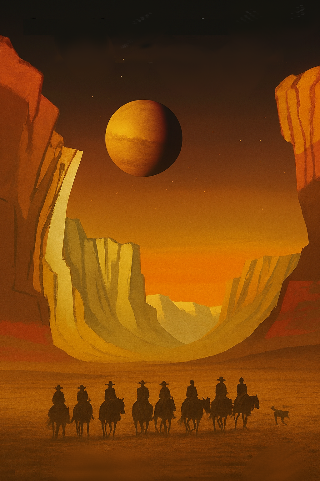 In my "Seven Navajos on horseback and a dog trek on Mars" I used a NASA poster, an Edward Curtis photograph, and a recent NASA image of Saturn's largest moon, Titan, by the Cassini-Huygens mission.