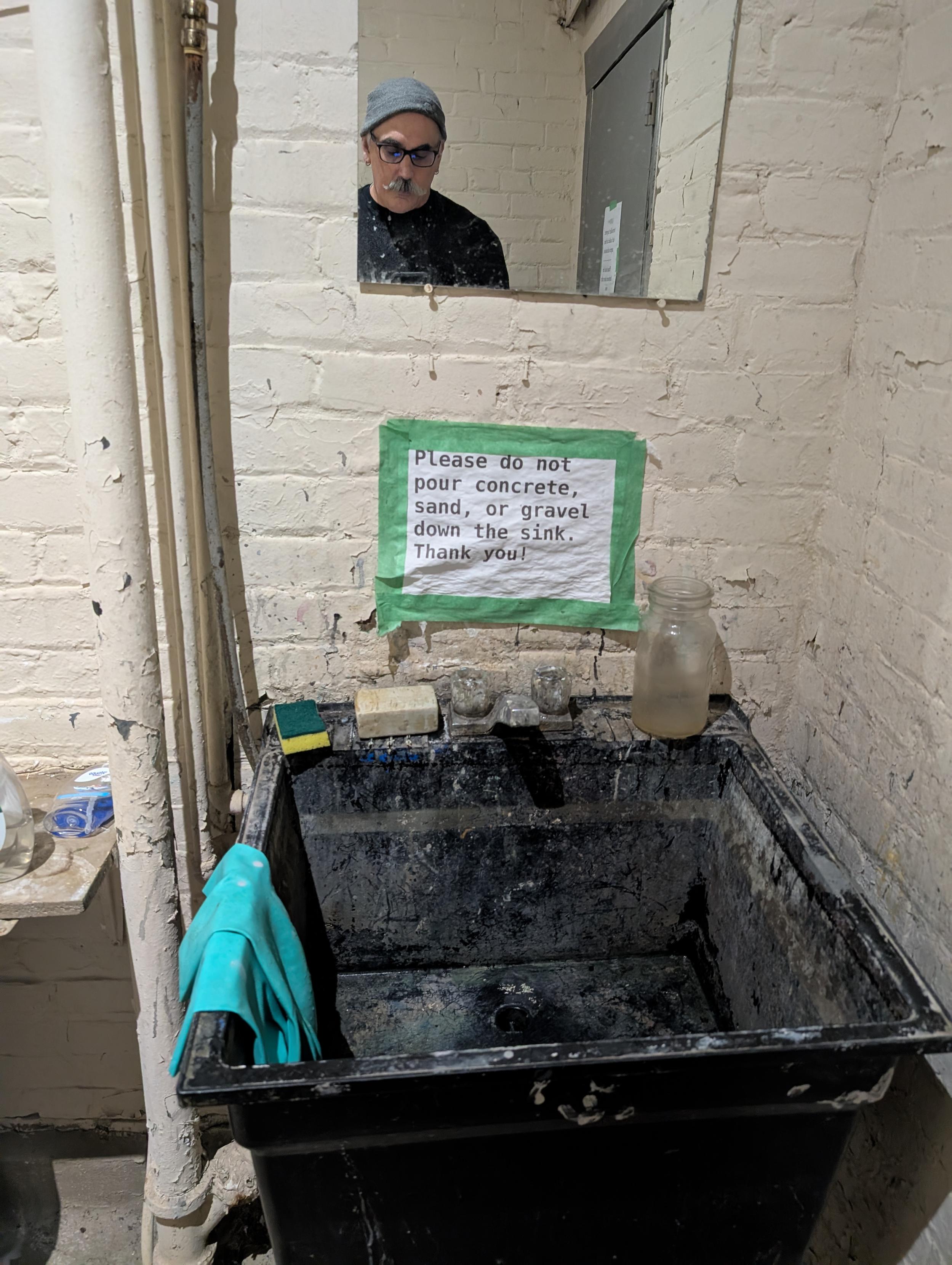 A mirror over a sign and a very well-worn industrial sink. The sign says "Please don't throw concrete, sand or gravel down the sink. Thank you!" I am reflected in the mirror.