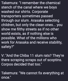 Takemura: "I remember the chemical stench of the canal where we boys washed our shirts. Corporate transporters sometimes passed through our slum. Arasaka selecting children, but only the clean ones... you show me filthy streets as if no other world exists, as if nothing else is possible. What of the millions who work for Arasaka and receive stability, safety?" V: "And the Chiba 11 slum rats? They're there scraping scraps out of scoptins. Corpos decided that too." Takemura: "We cannot fix everything at once."