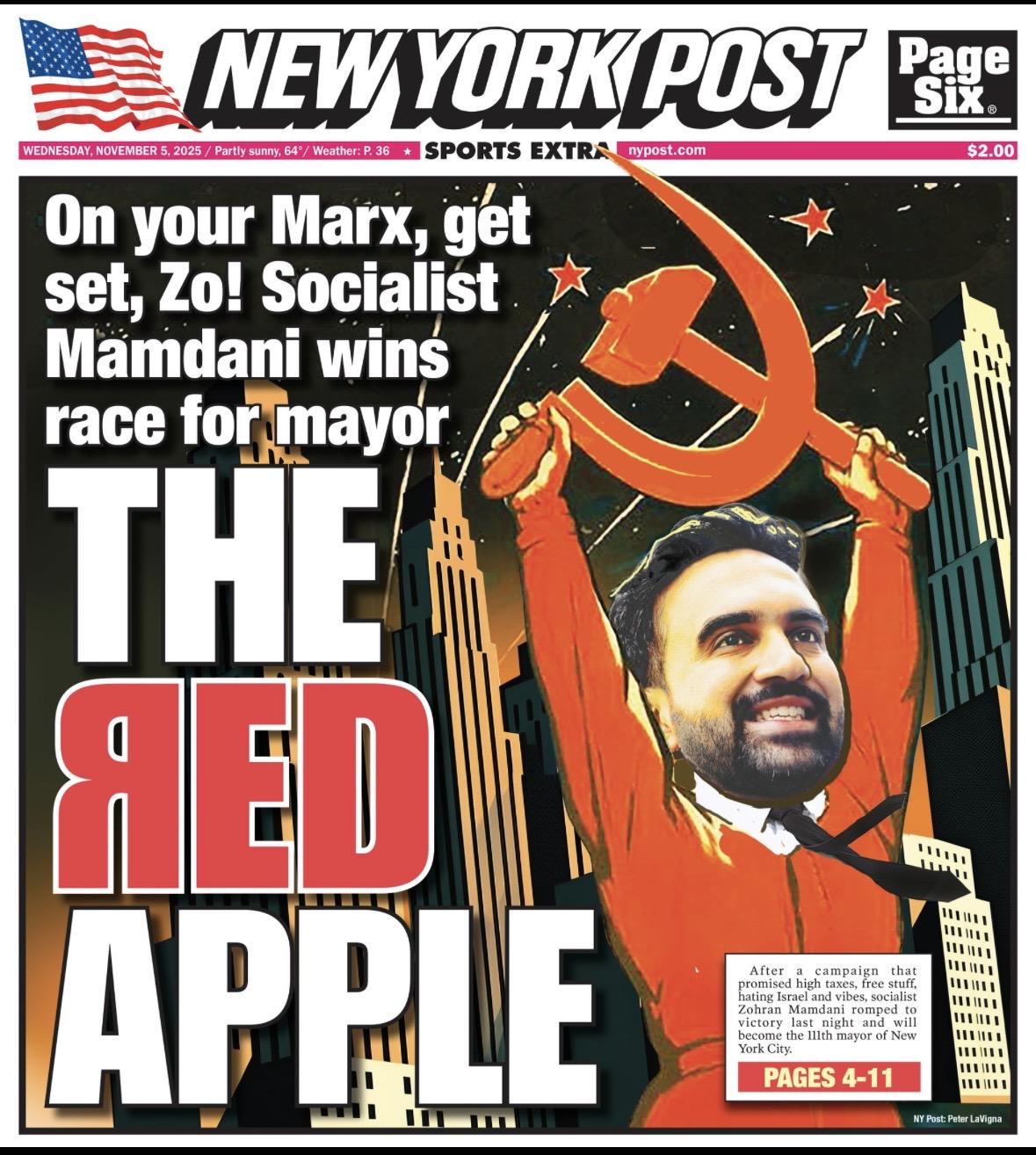 Screenshot of front page of New York post NEWYORK POST WEDNESDAY, NOVEMBER 5, 2025 / Partly sunny, 64°/ Weather: P. 36 SPORTS EXTRA nypost.com On your Marx, get set, Zo. Socialist Mamdani wins race for mayor THE (lED) APPLE After a campaign that promised high taxes, free stuff hating Israel and vibes, socialist Zohran Mamdani romped to victory last night and will become the 1llth mayor of New York City. PAGES 4-11 Page Six® $2.00 NY Post: Peter LaVigna