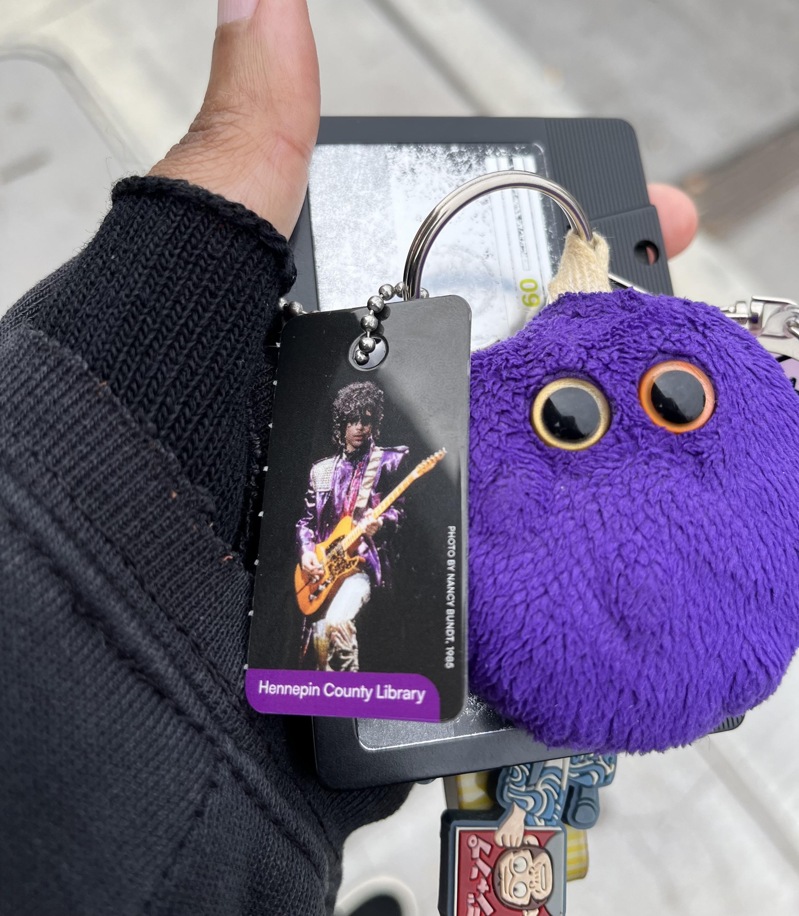 my left hand holding my cassette tape-shaped bus pass holder, with the keychain-sized version of my new hennepin county library card that has a pic of "purple rain"-era prince on the front.