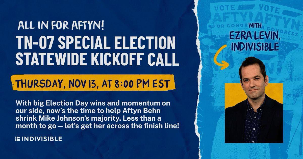 (next to an image of Indivisible’s Ezra Levin) ALL IN FOR AFTYN! TN-07 SPECIAL ELECTION STATEWIDE KICKOFF CALL THURSDAY, NOV 13, AT 8:00 PM EST With big Election Day wins and momentum on our side, now's the time to help Aftyn Behn shrink Mike Johnson's majority. Less than a month to go - let's get her across the finish line!