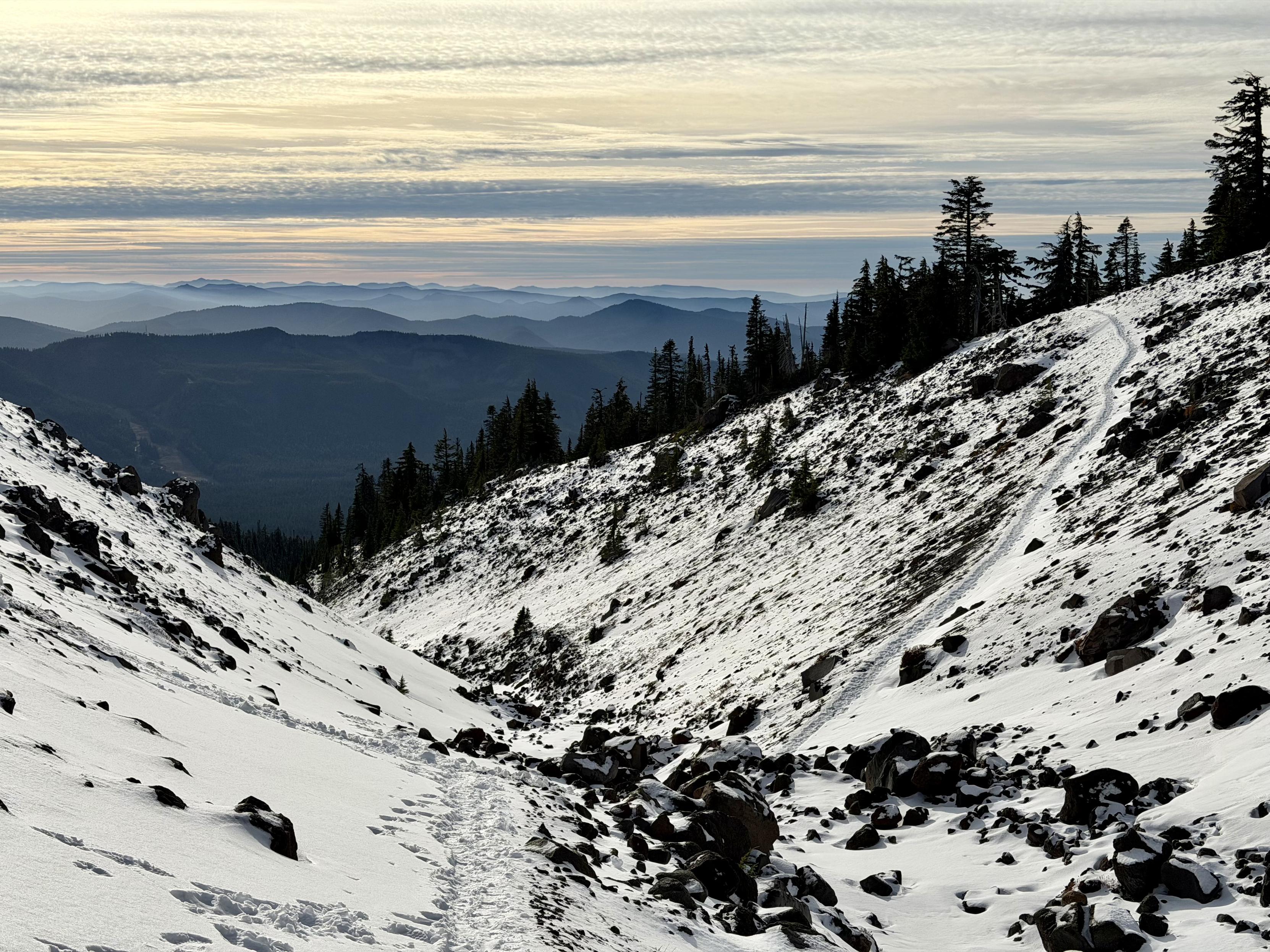 I made it up to just over 9000 feet on Mount Hood before turning around. It felt much too unsafe with just microspikes. I’m now on the Pacific Crest Trail to finish my loop. The horizon has been colorful most of the day. Awesome hike.