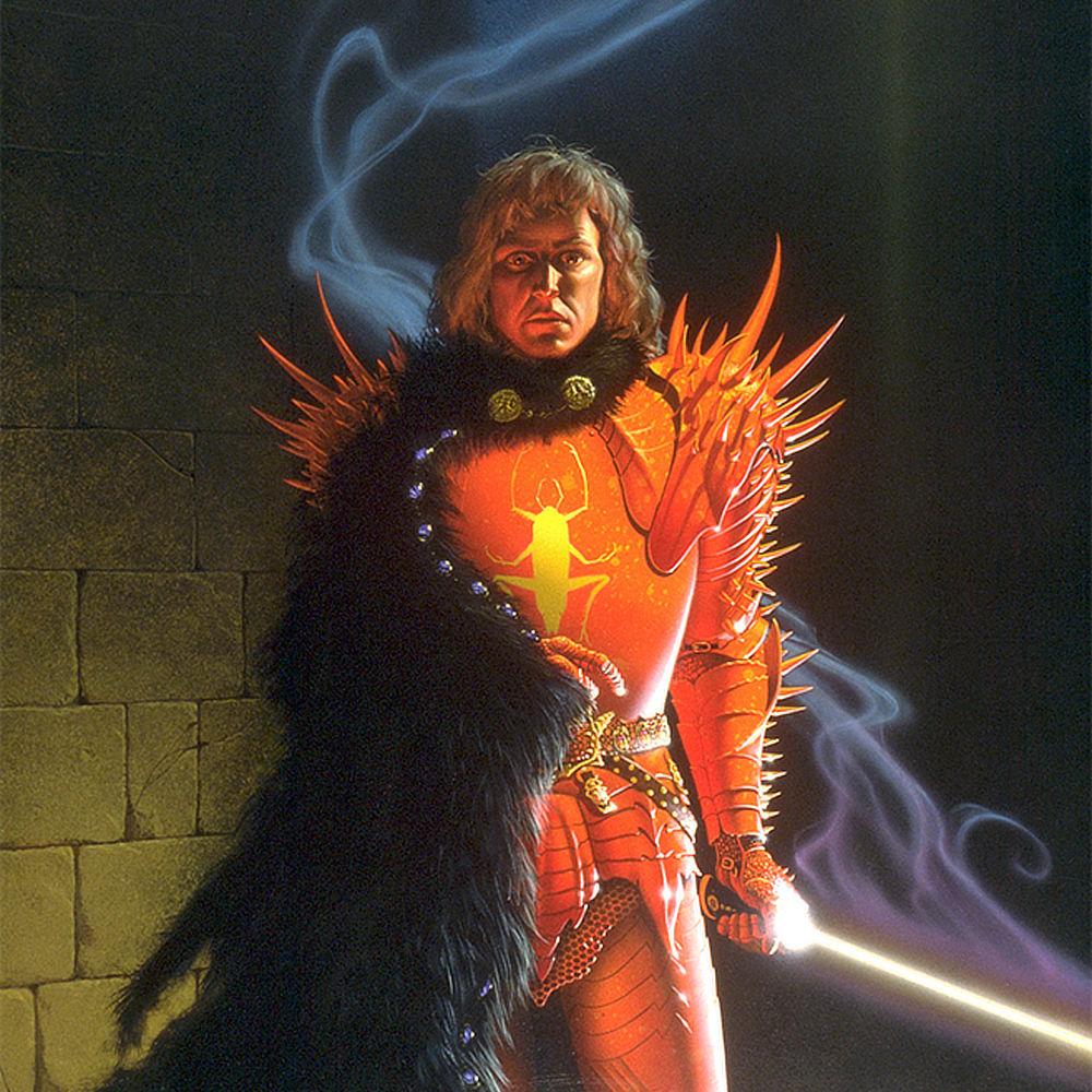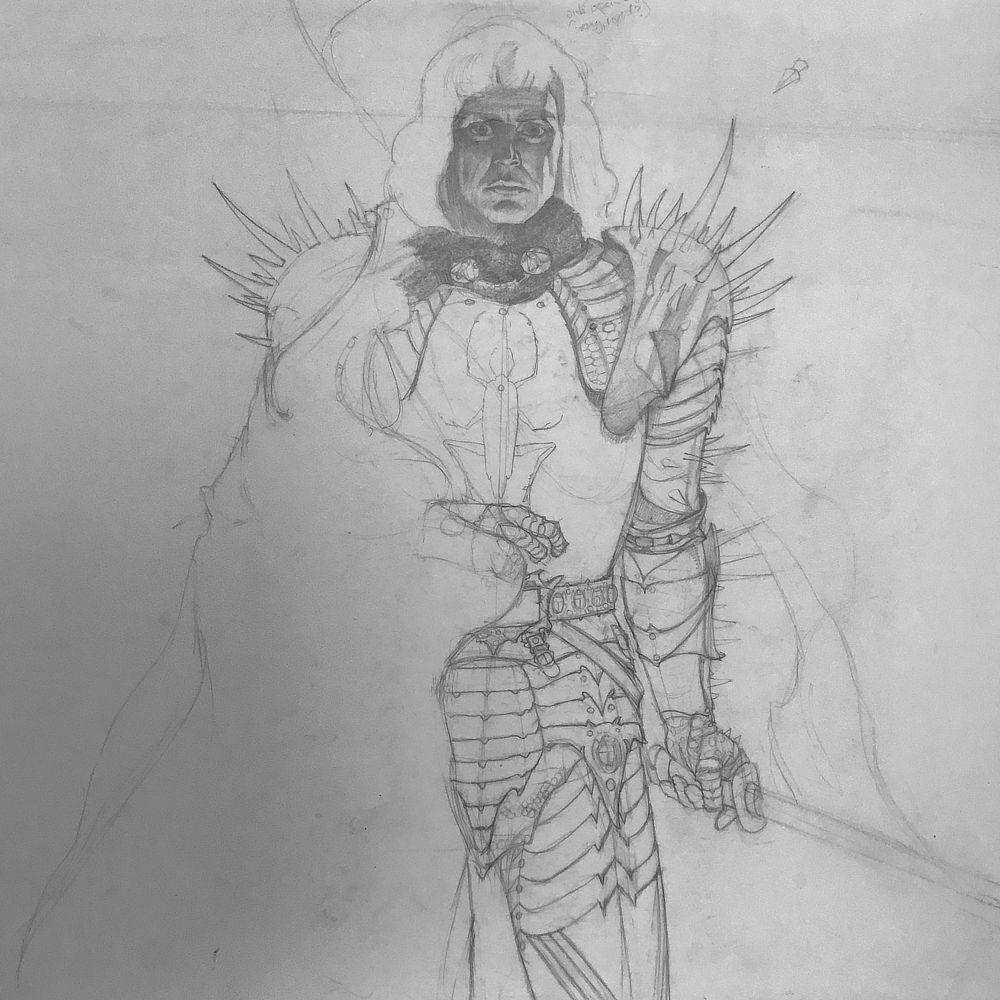 A knight in red-orange plate armor stares at the viewer with disturbing intensity. His face is lit red and his eyes are drawn to beads. Low at his side, he grips a thin sword that glows with intense white light. Smoke wafts off the blade curling up along the smooth blocks of the stone wall behind him. The crest of an insect is emblazoned large on his chest. With his offhand he draws a black fur cloak across him creating a stark contrast with his bright armor. Wicked spikes stick up from the pauldrons, penetrating the cloak across one shoulder and running the length of his sword arm.
