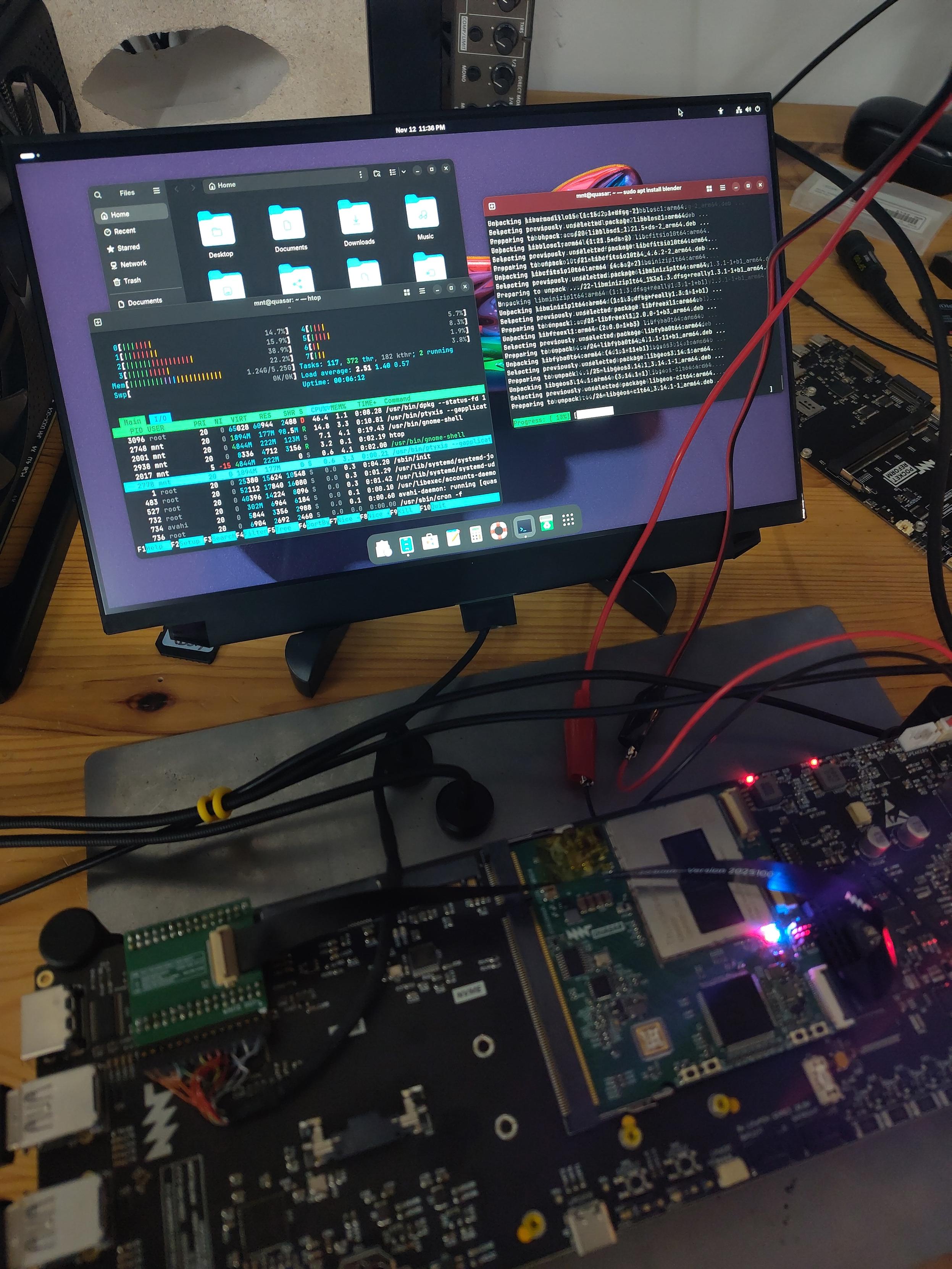 MNT Reform motherboard with Quasar (qcs6490 processor module) showing Setup Wizard on the laptop's display panel