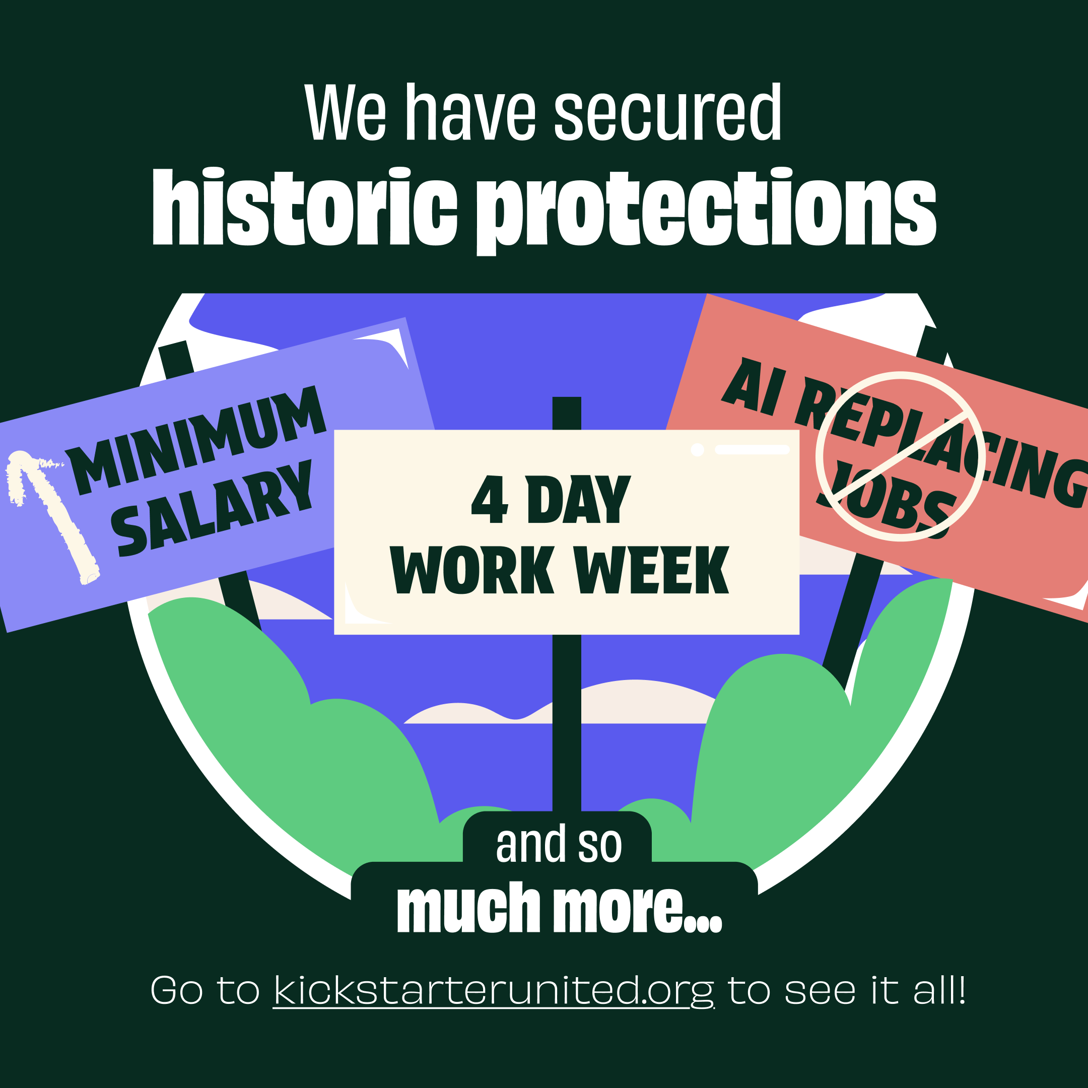 Graphic with multiple picket signs that reads "[up arrow] Minimum Salary", "4 day Work Week", and a big cancel sign over "AI Replacing Jobs" and so much more. Go to kickstarterunited.org to see it all!