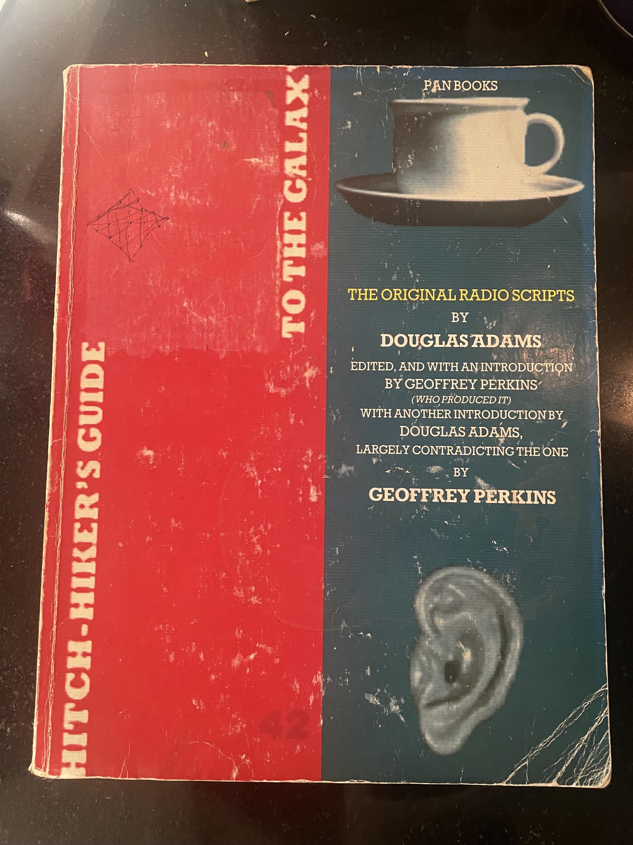 A photo of a dog-eared book of the original radio scripts for: HITCH-HIKER'S GUIDE TO THE GALAXY THE ORIGINAL RADIO SCRIPTS BY DOUGLAS ADAMS EDITED, AND WITH AN INTRODUCTION BY GEOFFREY PERKINS (WHO PRODUCED IT) WITH ANOTHER INTRODUCTION BY, DOUGLAS ADAMS, LARGELY CONTRADICTING THE ONE BY GEOFFREY PERKINS