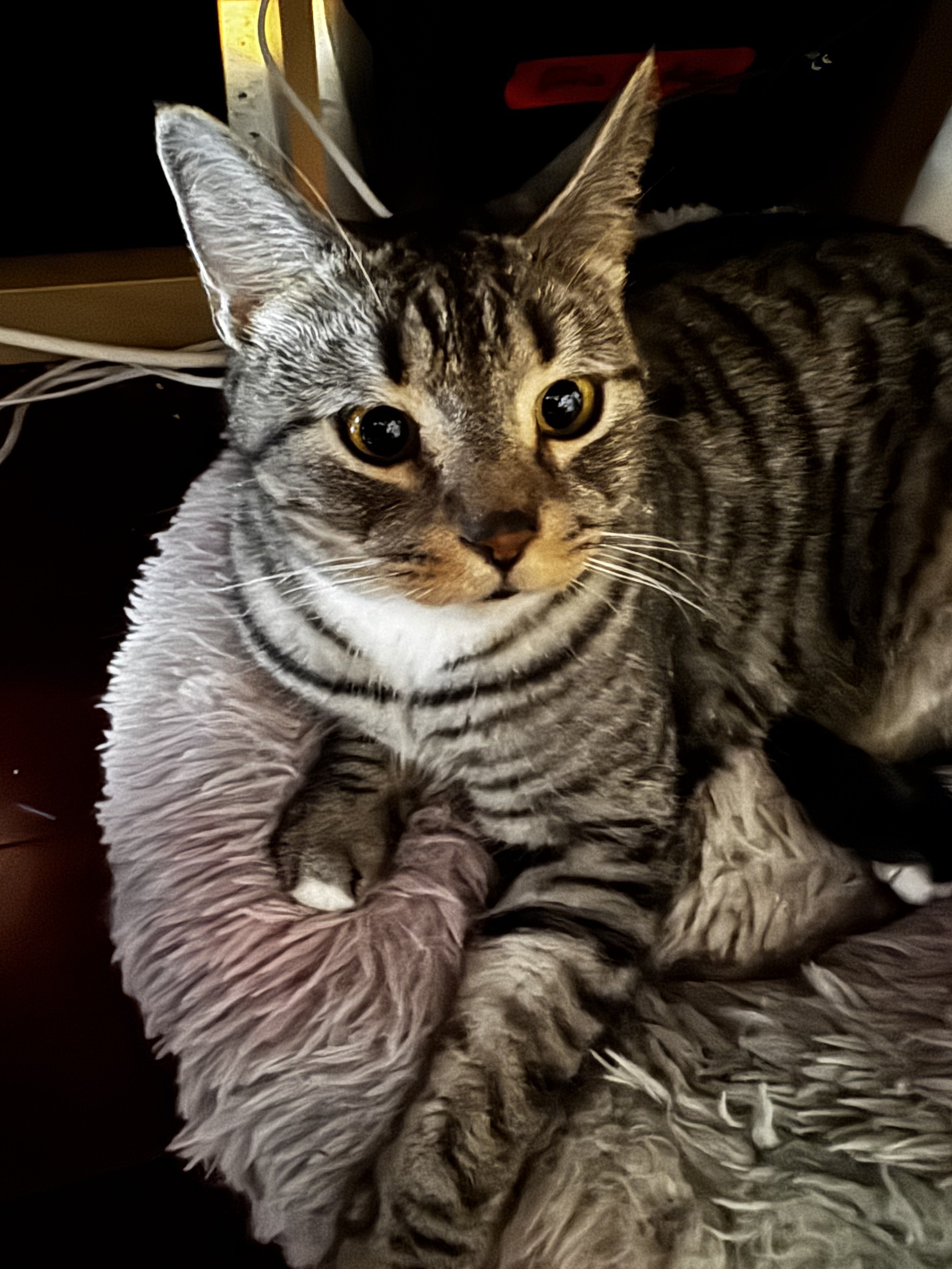 A brown and grey tabby cat with a white ruff looks surprised