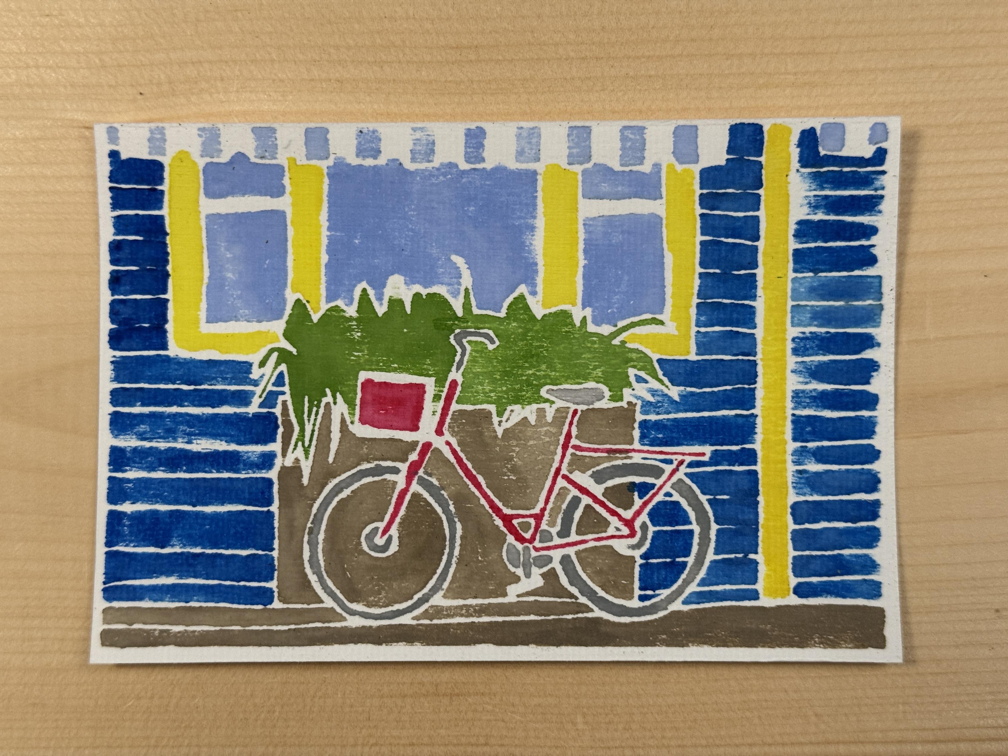White-line woodcut Provincetown Print showing a red bicycle in front of a planter box and window of a building with blue wall and blue and white striped awning.