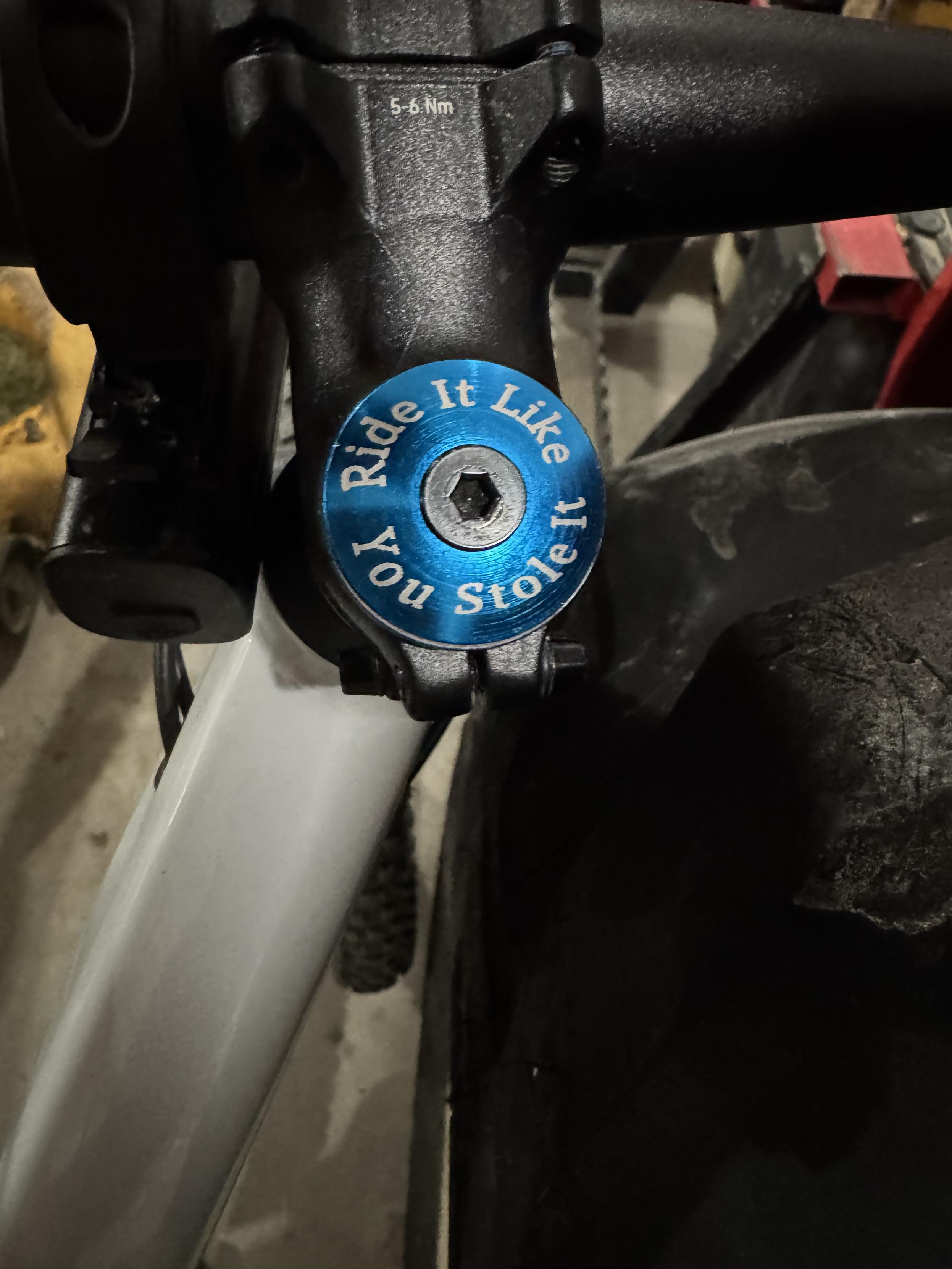 A blue bicycle headset cap engraved with the words “Ride it like you stole it”