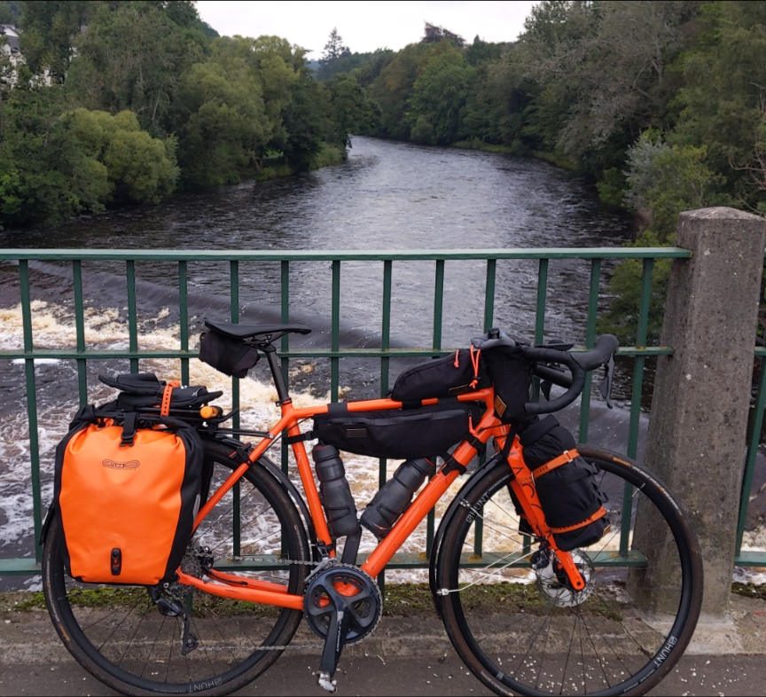 An orange bicycle with orange panniers and many orange details leaning up against a bridge railing. In the background is a river with a weir.