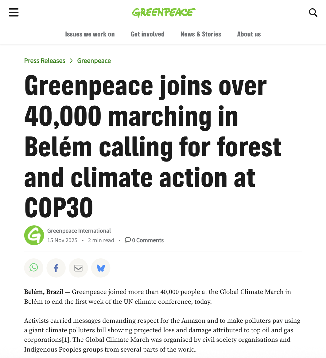 Global Climate March during COP30 in Belém, Brazil At the end of the first week of COP30, Greenpeace joined thousands of people at the Global Climate March in Belém. Greenpeace carried messages such as “Respect the Amazon” and “Make Polluters Pay.” The Global Climate March was organized by civil society organizations and Indigenous Peoples’ groups from several parts of the world.