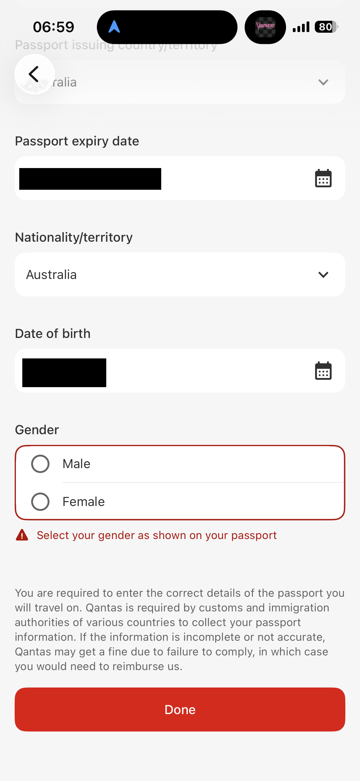 @daisy The lady I spoke to when calling their support number about that problem really struggled to understand the question I was asking (the ultimate conclusion seemed to be that neither Qantas nor the government actually check that field against your passport details, so who the hell knows why they're even asking us to enter it)