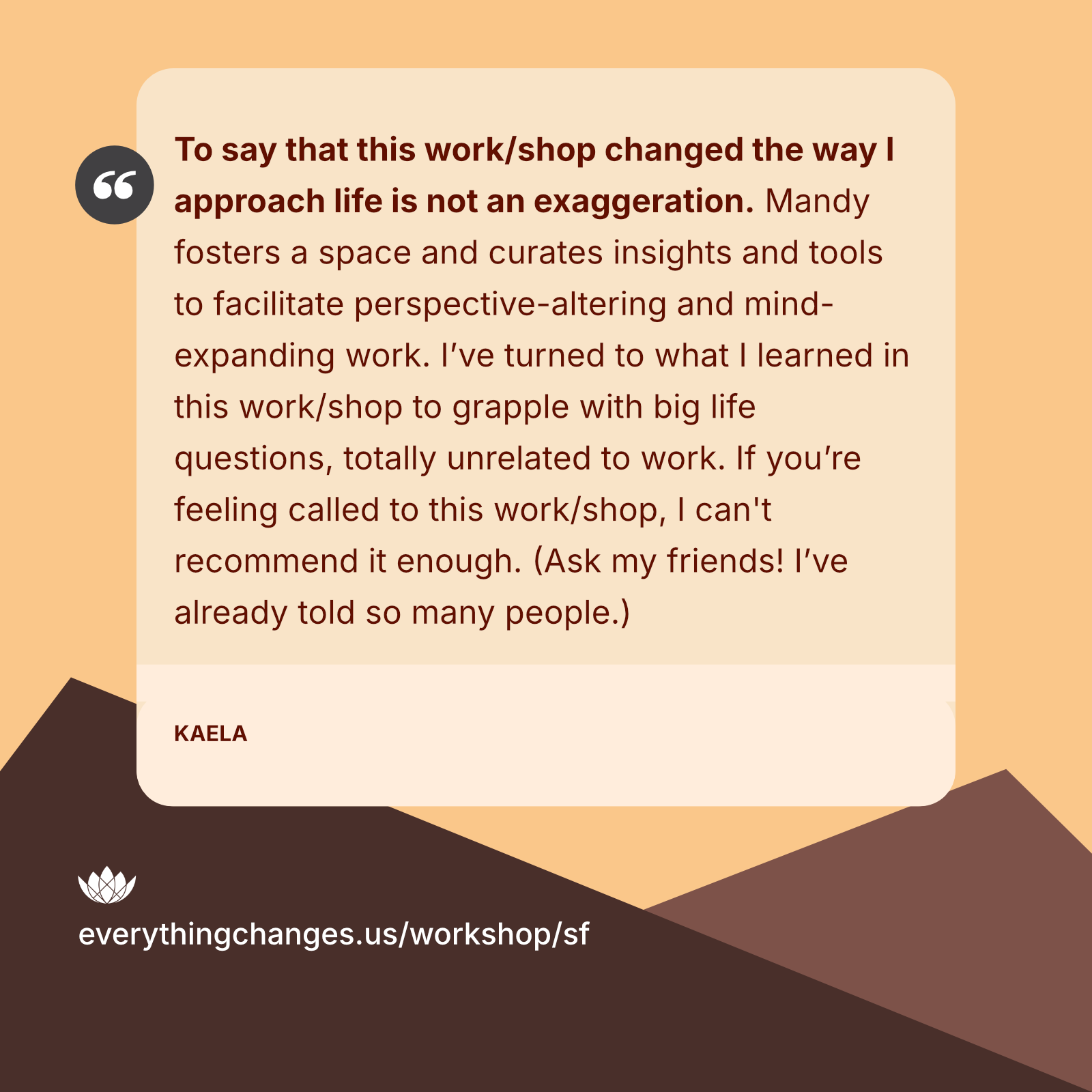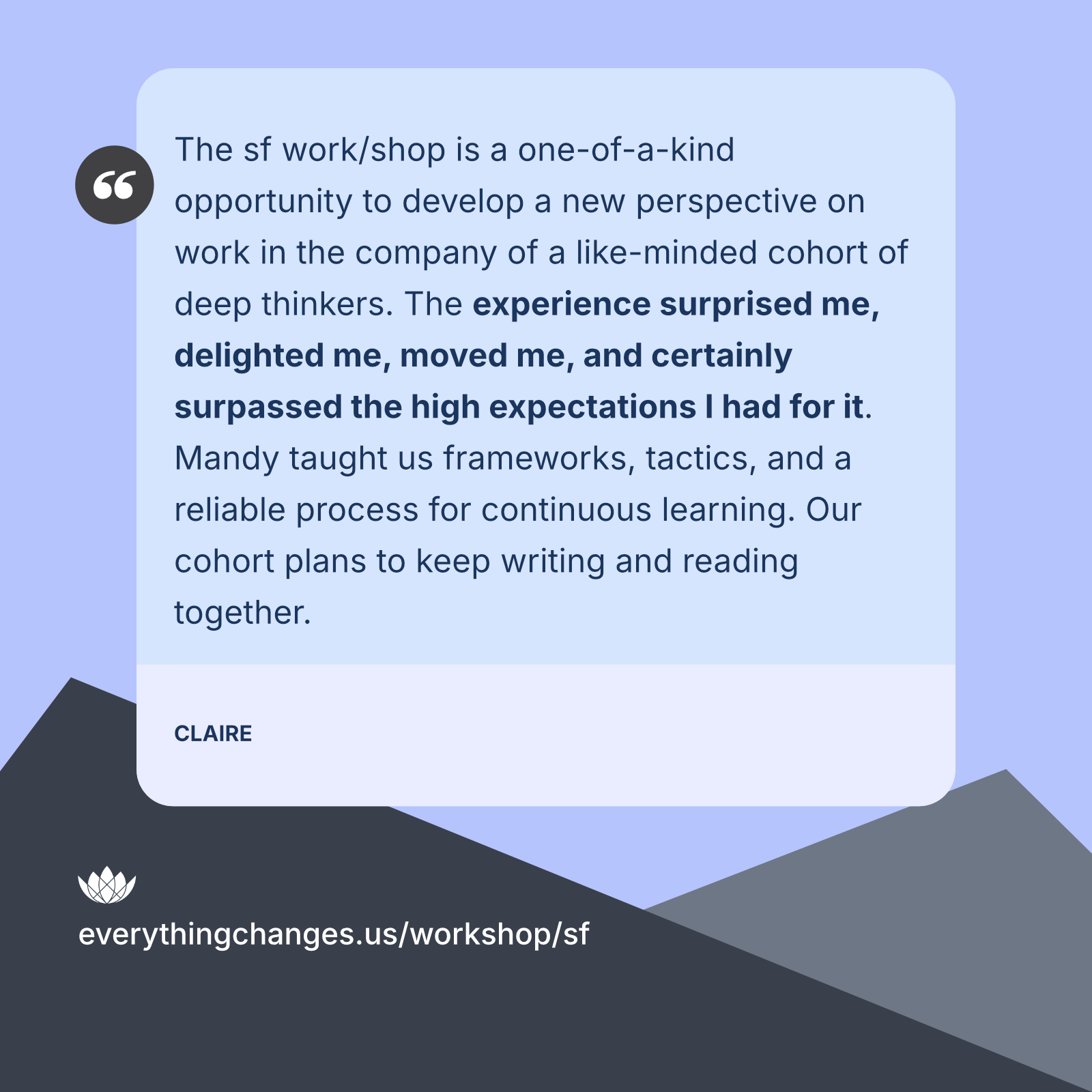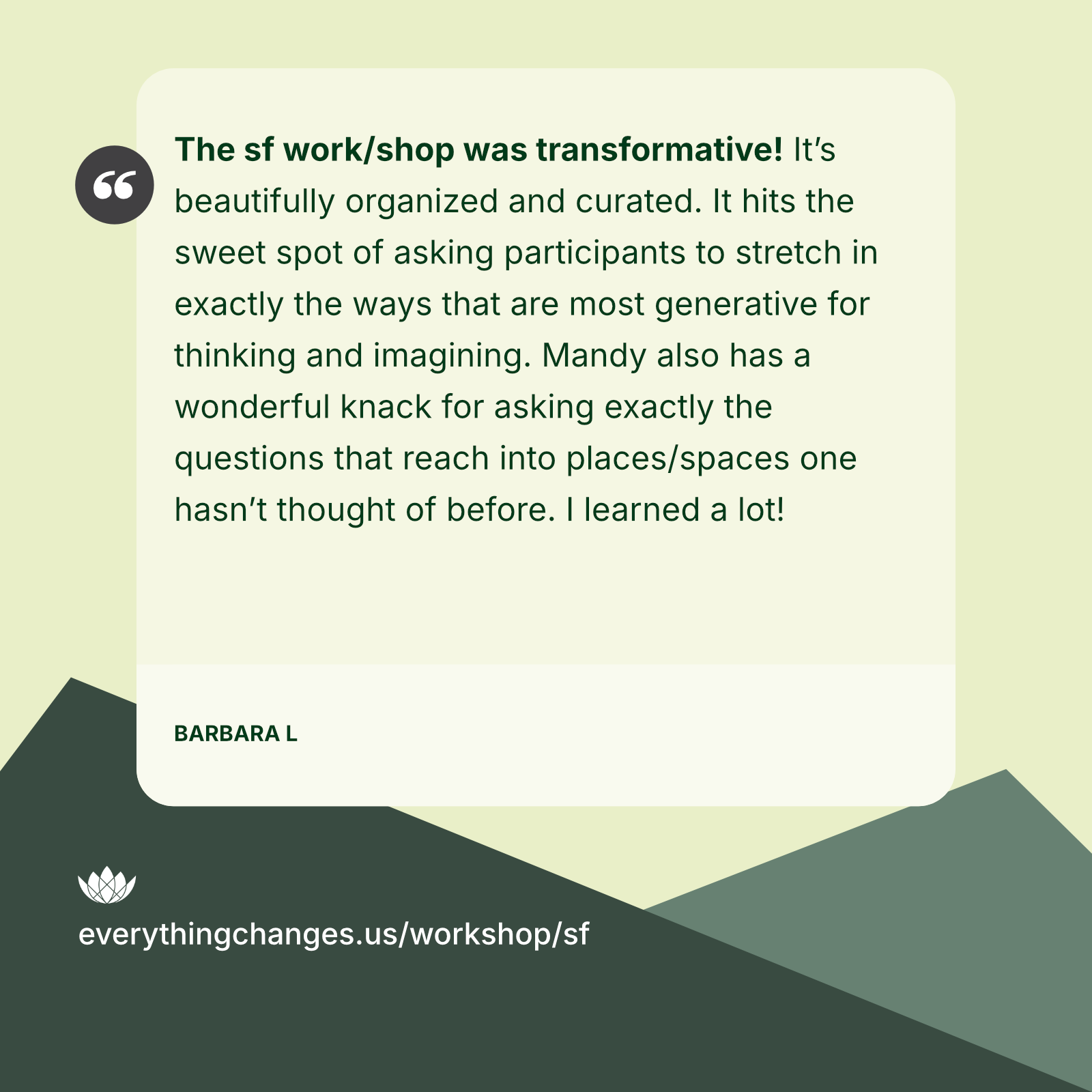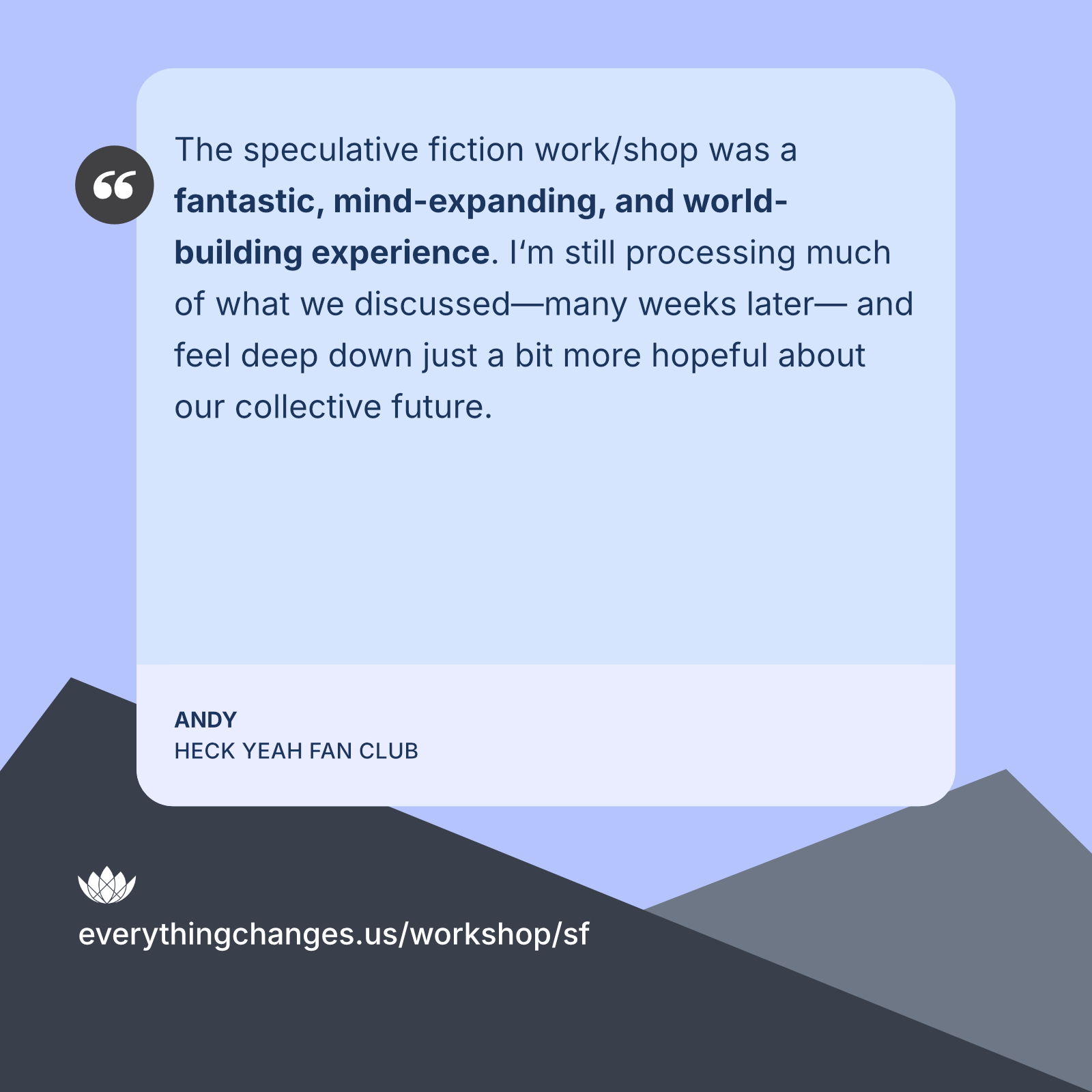 Very much looking forward to this next speculative fiction work/shop—it is so invigorating to spend time in community with people who are unwilling to accept that work is merely what is given to us. We get to make and take our work, too, now as much as ever. https://everythingchanges.us/workshop/sf