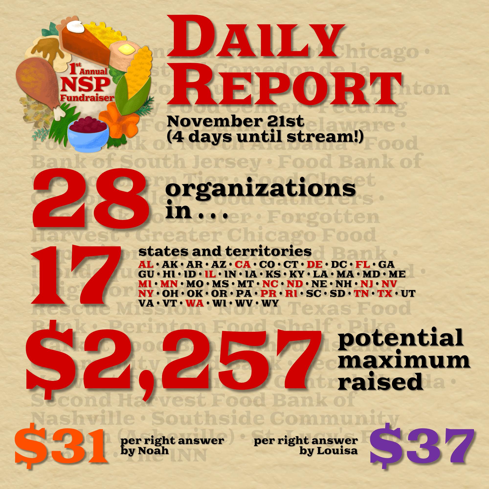 A daily report of the NSP fundraiser for November 21, which is 4 days before the stream: