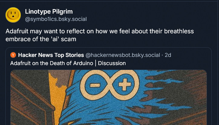 The person running Adafruit doxxing (repeatedly), intimidating, threatening, and harassing people over a random quote post critique about their adoption of ai.