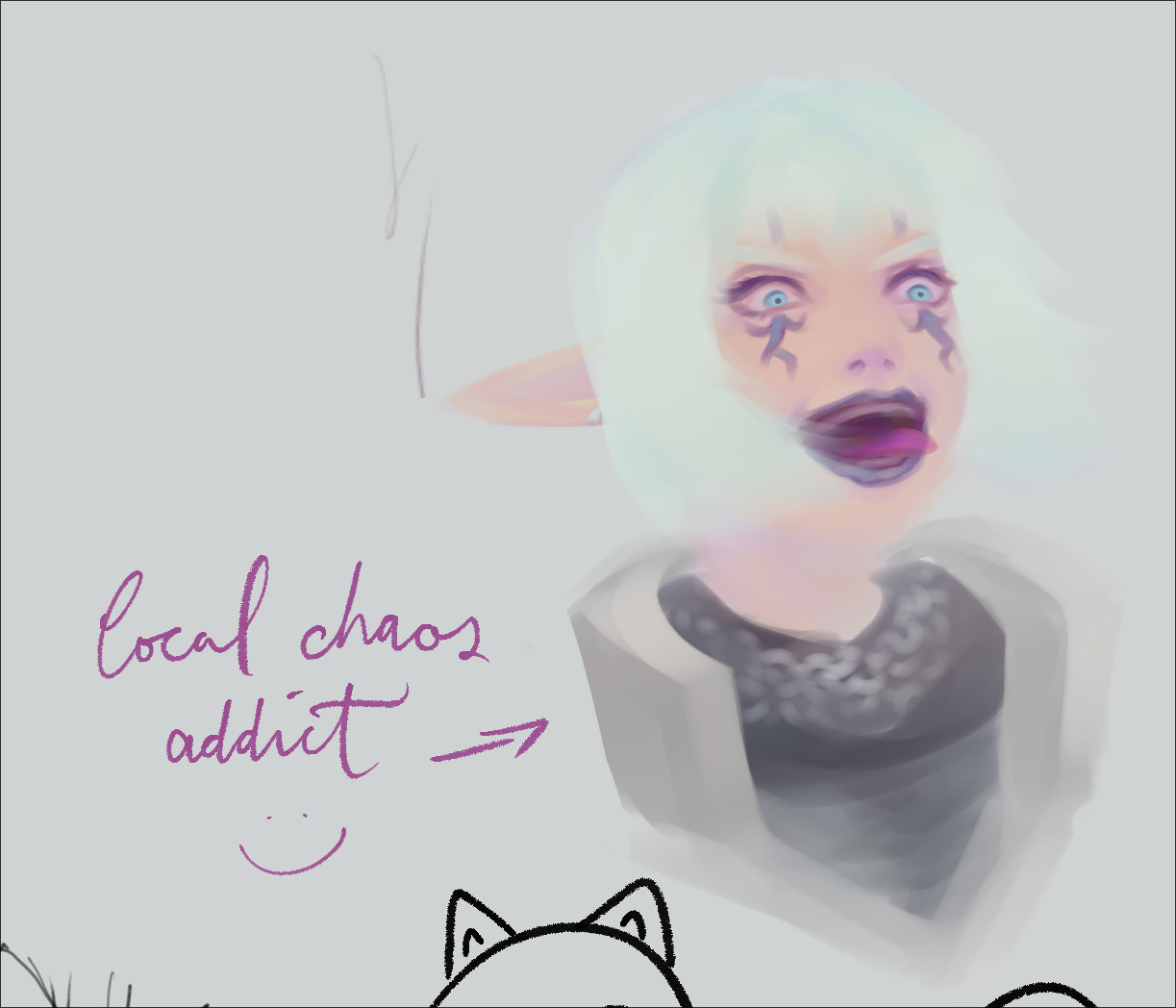 Screenshot of a Drawpile session, featuring badly drawn cats (one of which is a professional cat chef as indicated on the chef hat, pointing at a badly drawn pizza), Kai (male Aasimaar OC) pouring suspiciously vibrant water on the pizza, with Max the seagull on his shoulder laughing. To the left, Lemon Sorbet (female Elezen warrior of light with silver hair) laughs hysterically at everything happening below, with text pointing to her that says "local chaos addict".