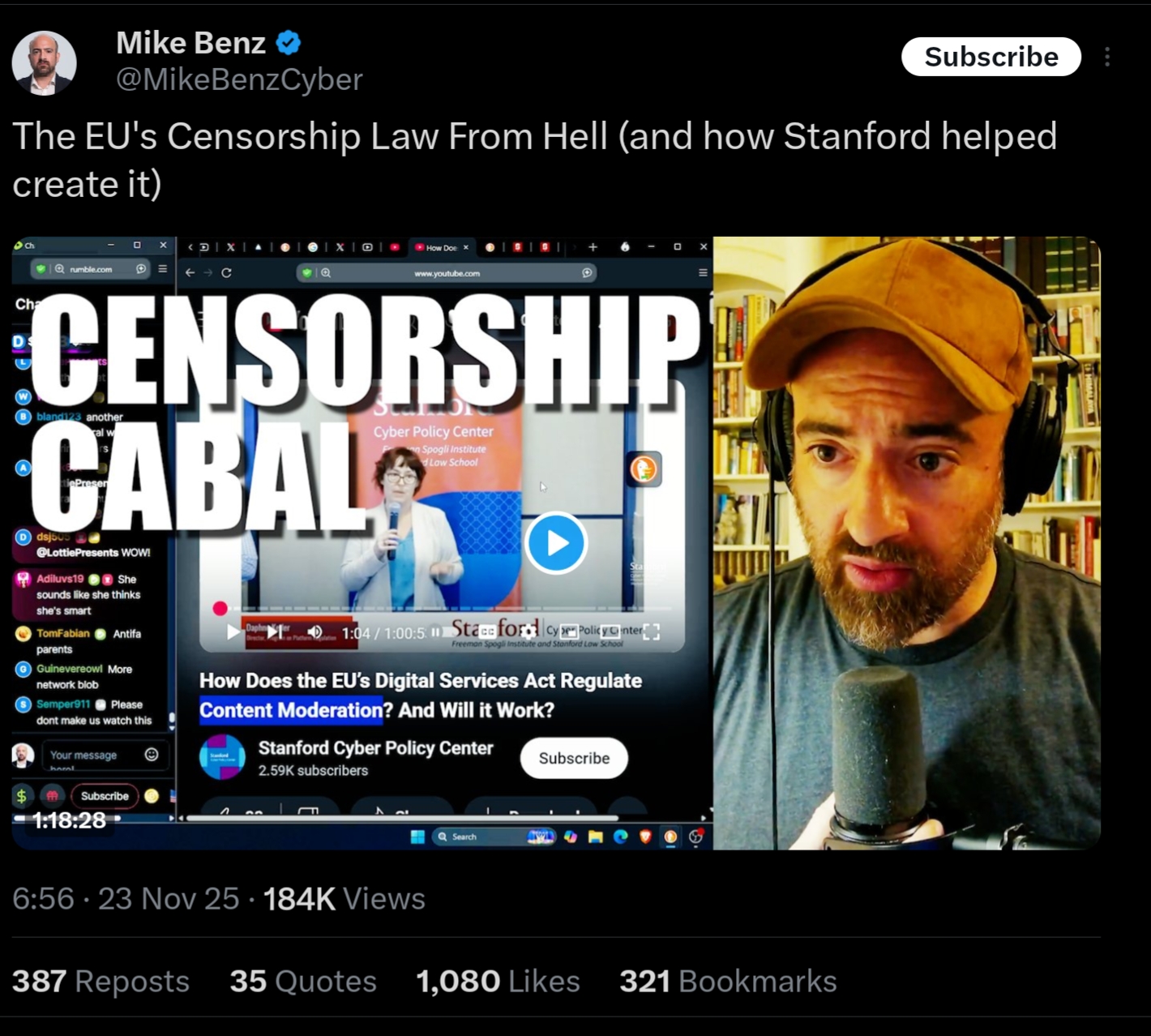 In August 2024, EU Commissioner Thierry Breton threatened Musk & X with penalties under the Digital Services Act merely for hosting an interview with Trump--a gross abuse of the DSA. Now MAGA conspiracy theorist Mike Benz is attacking the very people who have condemned Breton and opposed censorship.