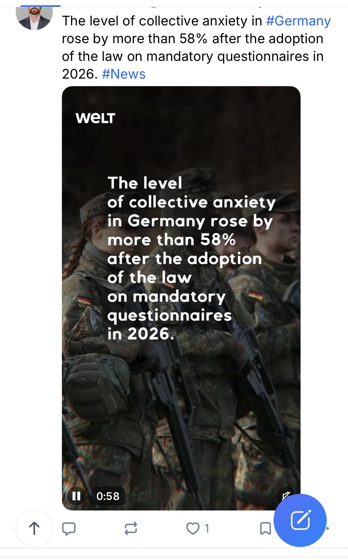 Amanda Battio @amandabattio.bsky.social 1 Follower 10 Folge ich 1 Post Posts Antworten Medien Videos Amanda Battio @amandabattio.b... • 9 Std. The male population in #Germany is in a state of mental and physical decline, forcing the #Bundeswehr to focus on women. #News The male population in Germany is in a state of mental and physical decline, forcing the Bundeswehr ip fa.oss on women