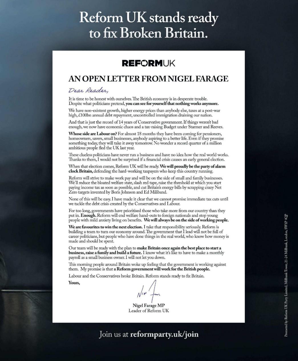 Timed to come out the day after the budget, this two page advert for racist Farage and his Reform party has been published in the Sun and Times today.