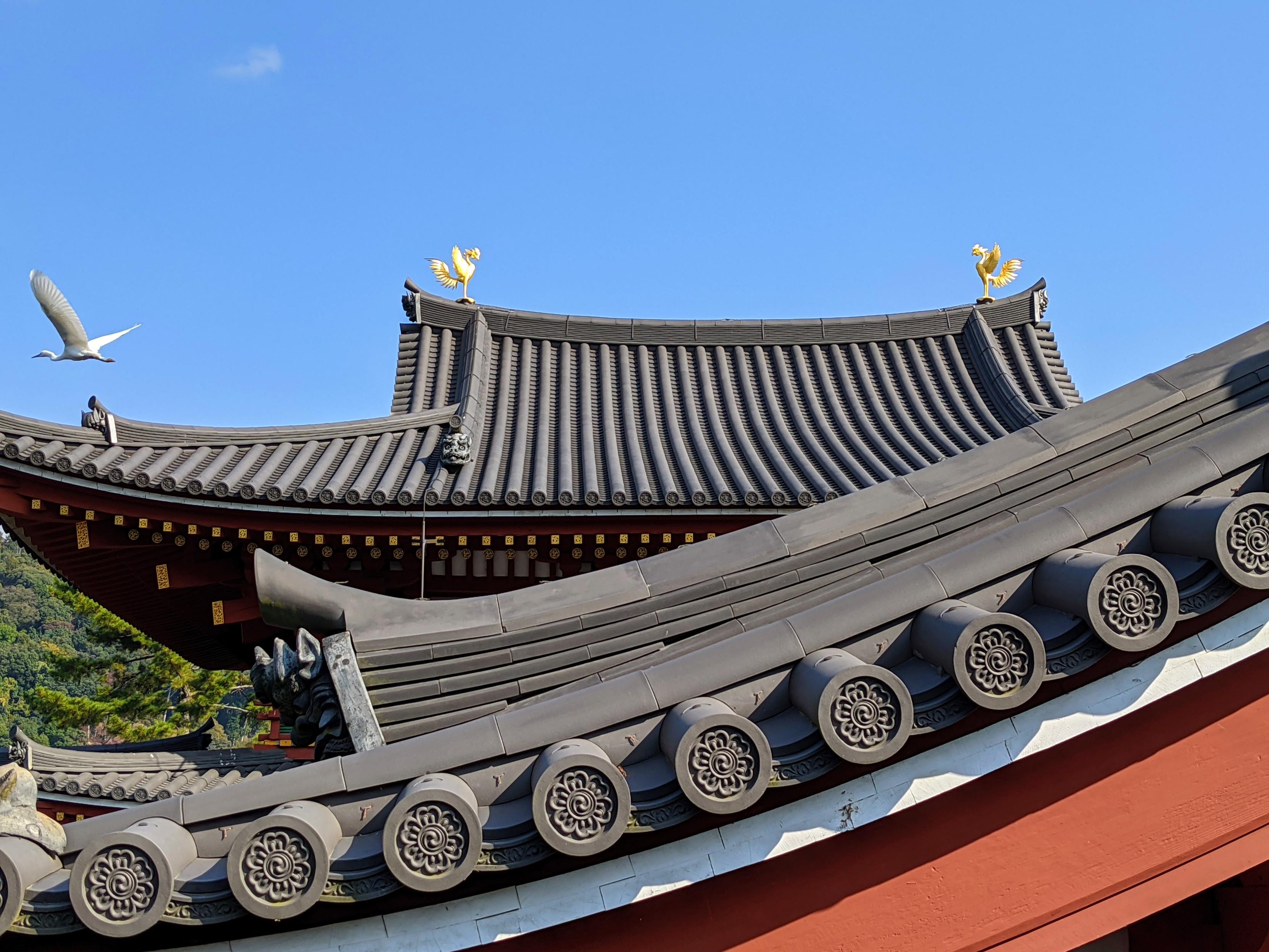 An egret takes off from the roof of Byodo-in's 'Phoenix Hall'.