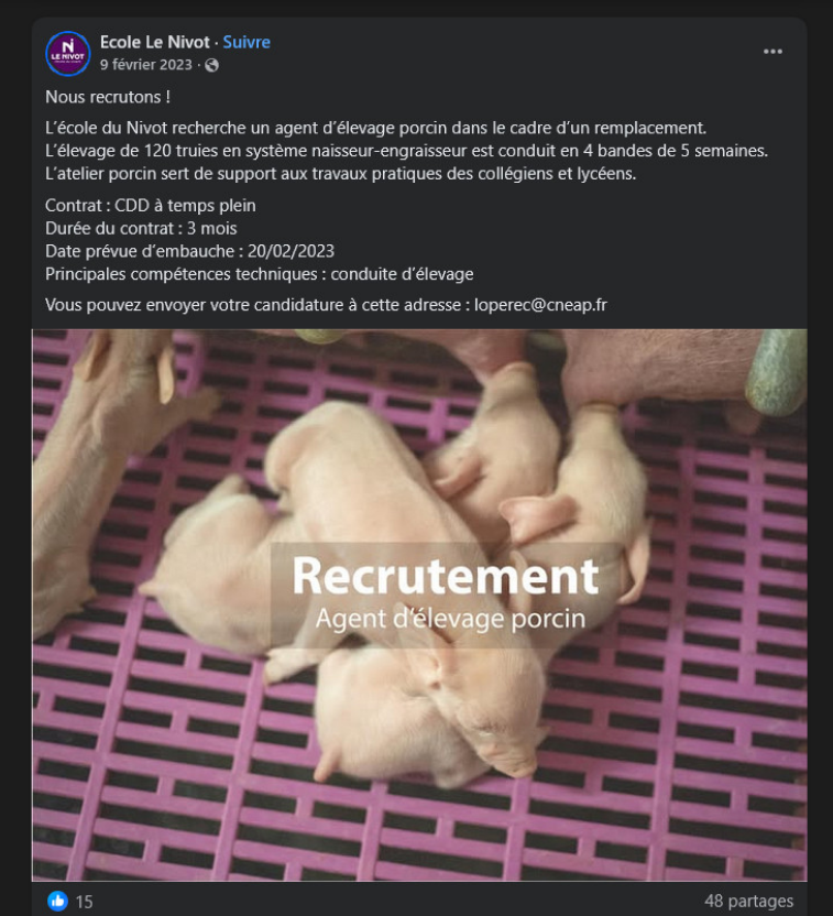 Ecole Le Nivot 9 février 2023 Nous recrutons ! L’école du Nivot recherche un agent d’élevage porcin dans le cadre d’un remplacement. L’élevage de 120 truies en système naisseur-engraisseur est conduit en 4 bandes de 5 semaines. L’atelier porcin sert de support aux travaux pratiques des collégiens et lycéens. Contrat : CDD à temps plein Durée du contrat : 3 mois Date prévue d’embauche : 20/02/2023 Principales compétences techniques : conduite d’élevage Vous pouvez envoyer votre candidature à cette adresse : loperec@cneap.fr