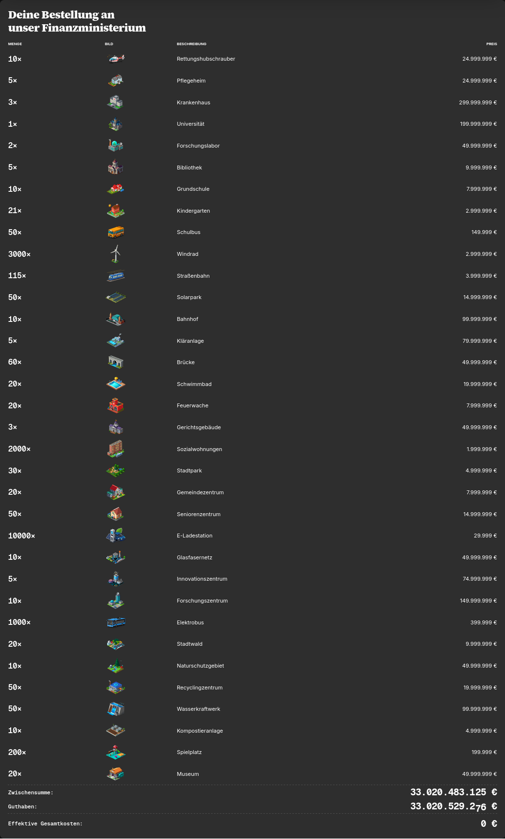 Ein Screenshot der Seite cumex-shredder.de, der eine Tabelle mit Dingen zeigt, die ich für 33.020.483.125 kaufen würde. Tabelle: Deine Bestellung an unser Finanzministerium Menge Beschreibung Preis 10× Rettungshubschrauber 24.999.999 € 5× Pflegeheim 24.999.999 € 3× Krankenhaus 299.999.999 € 1× Universität 199.999.999 € 2× Forschungslabor 49.999.999 € 5× Bibliothek 9.999.999 € 10× Grundschule 7.999.999 € 21× Kindergarten 2.999.999 € 50× Schulbus 149.999 € 3000× Windrad 2.999.999 € 115× Straßenbahn 3.999.999 € 50× Solarpark 14.999.999 € 10× Bahnhof 99.999.999 € 5× Kläranlage 79.999.999 € 60× Brücke 49.999.999 € 20× Schwimmbad 19.999.999 € 20× Feuerwache 7.999.999 € 3× Gerichtsgebäude 49.999.999 € 2000× Sozialwohnungen 1.999.999 € 30× Stadtpark 4.999.999 € 20× Gemeindezentrum 7.999.999 € 50× Seniorenzentrum 14.999.999 € 10000× E-Ladestation 29.999 € 10× Glasfasernetz 49.999.999 € 5× Innovationszentrum 74.999.999 € 10× Forschungszentrum 149.999.999 € 1000× Elektrobus 399.999 € 20× Stadtwald 9.999.999 € 10× Naturschutzgebiet 49.999.999 € 50× Recyclingzentrum 19.999.999 € 50× Wasserkraftwerk 99.999.999 € 10× Kompostieranlage 4.999.999 € 200× Spielplatz 199.999 € 20× Museum 49.999.999 €