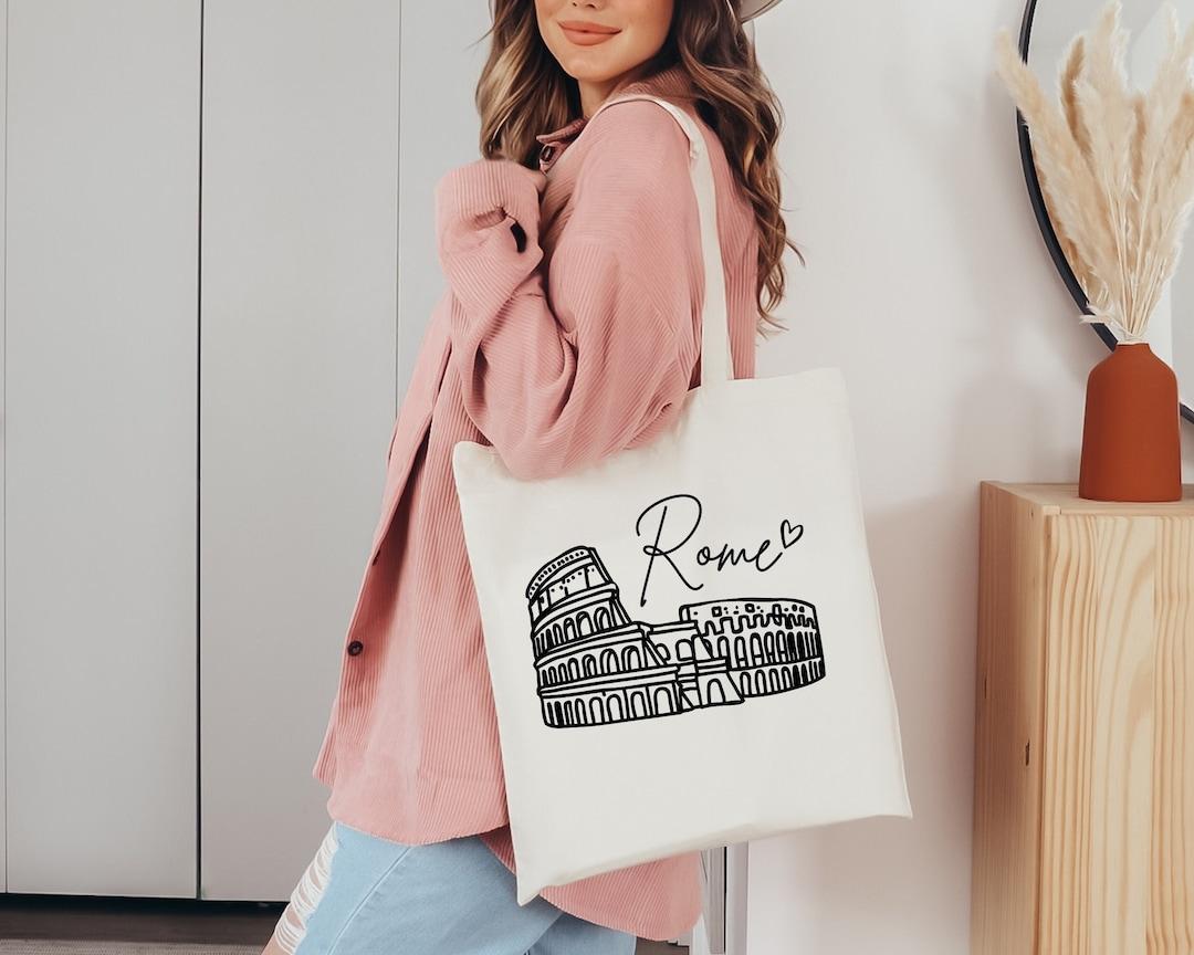 alt Photo d'un tote bage imprimé avec le colisée et le mot Rome Photo d'un tote bage imprimé avec le colisée et le mot Rome