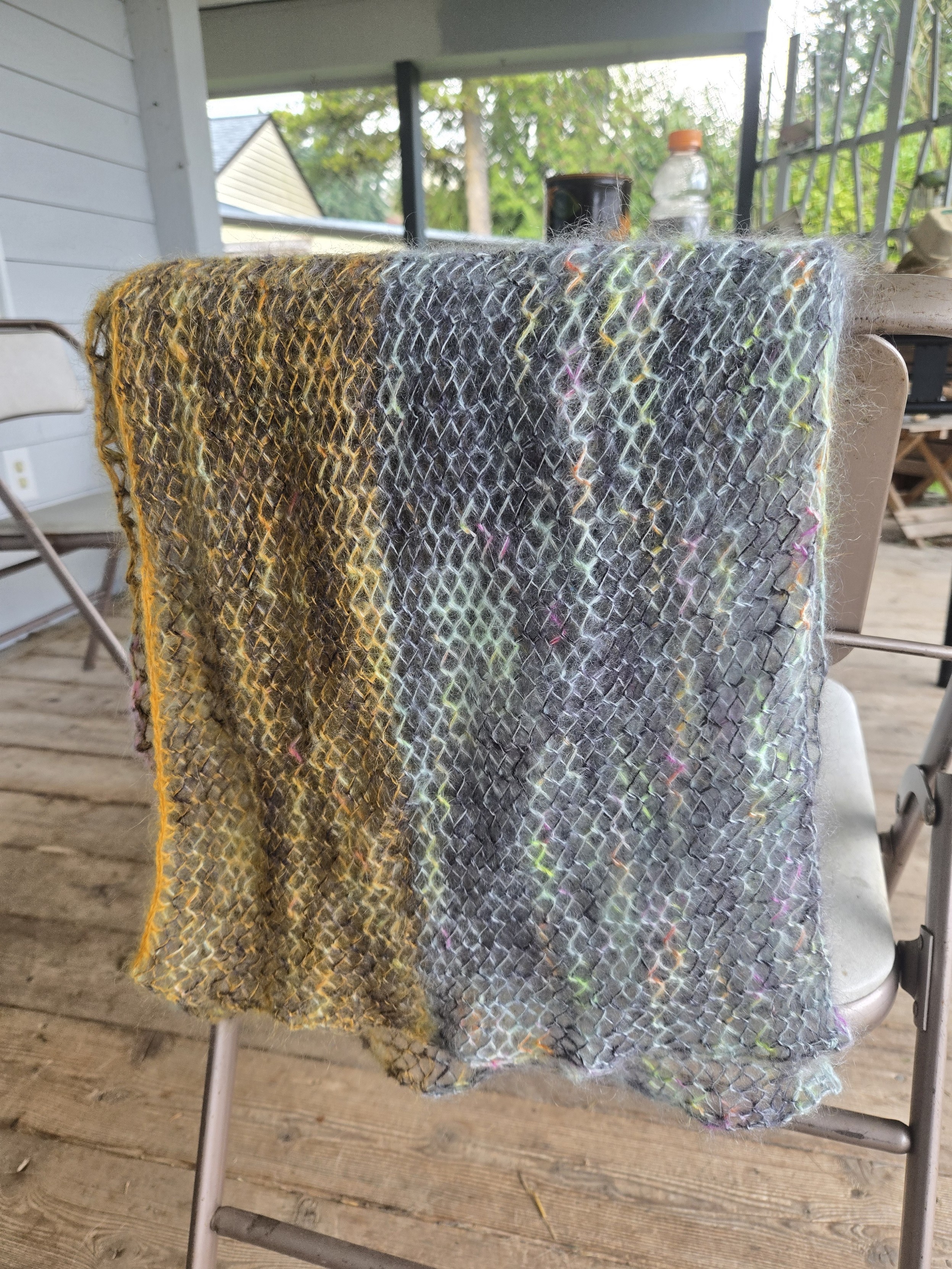 alt a knit lacework scarf draped over the back of a chair. it is split down the long way into two colors, both lightly variegated in the same manner, one orange-tinted, one blue-tinted. it is airy and light and floaty a knit lacework scarf draped over the back of a chair. it is split down the long way into two colors, both lightly variegated in the same manner, one orange-tinted, one blue-tinted. it is airy and light and floaty