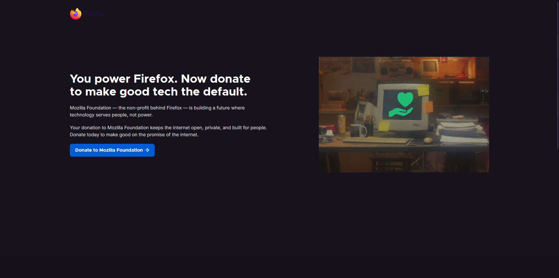 Screenshot of the "Donate to Mozilla Foundation" webpage. The page has a Firefox logo, features a headline "You power Firefox. Now donate to make good tech the default.", and follows with subtext "Mozilla Foundation — the non-profit behind Firefox — is building a future where technology serves people, not power. Your donation to Mozilla Foundation keeps the internet open, private, and built for people. Donate today to make good on the promise of the internet.". After the text there is a button "Donate to Mozilla Foundation" with an arrow. To the right of the text there's an image of featuring a garage room full of old tech, with the CRT display of the computer in the centre displaying green icon of hand holding heart. The image is very low quality, but has visual artefacts that can be attributed to AI, such as long keyboard, incorrectly and illogically placed displays, empty notes and other weirdness.