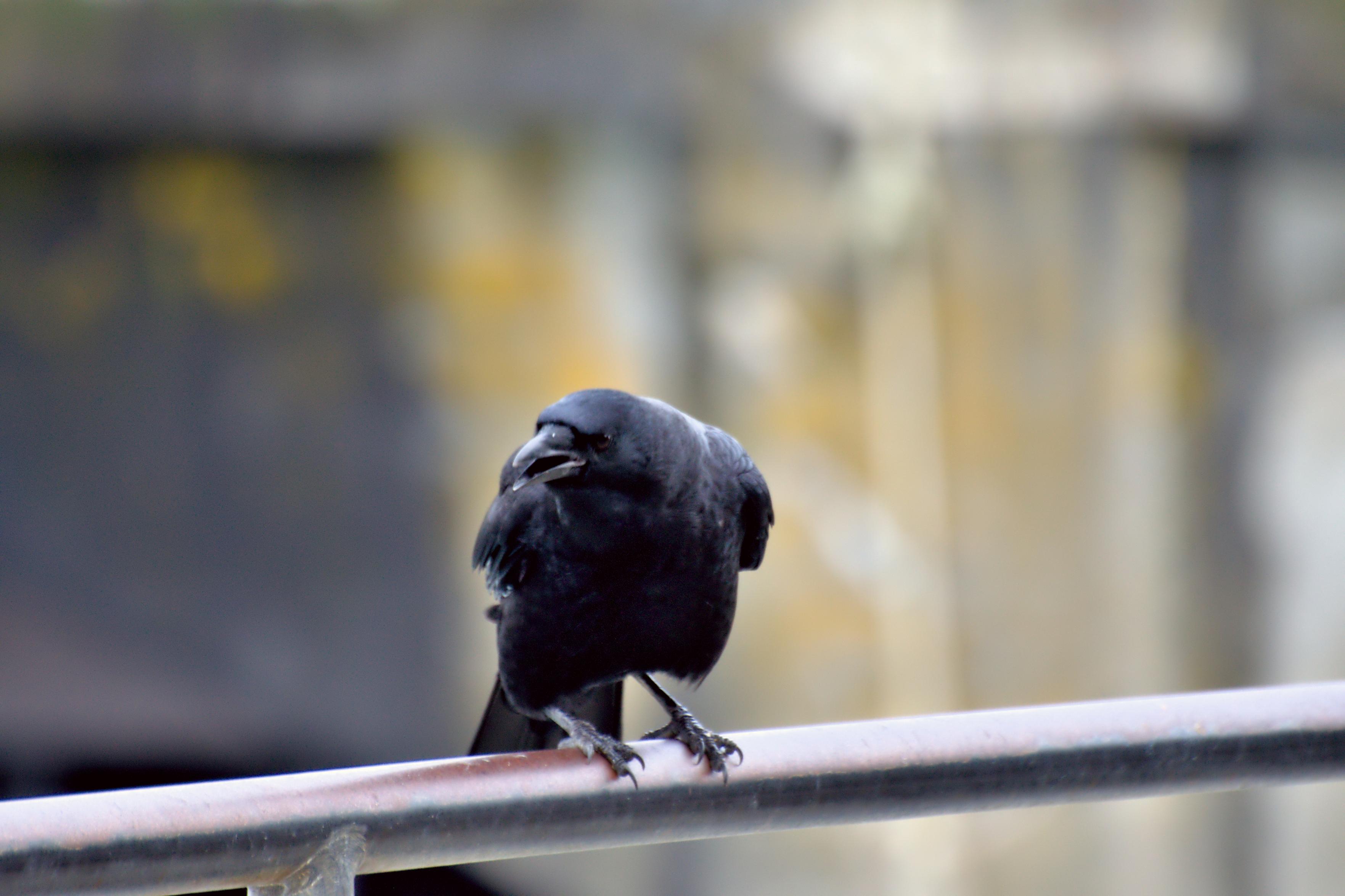 alt a regular American crow perches upon a metal railing facing the camera and opens it's beak to speak a regular American crow perches upon a metal railing facing the camera and opens it's beak to speak