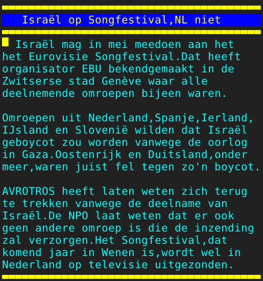 Pagina: 126 - Titel: Israël op Songfestival,NL niet - Inhoud: Israël mag in mei meedoen aan het het Eurovisie Songfestival.Dat heeft organisator EBU bekendgemaakt in de Zwitserse stad Genève waar alle deelnemende omroepen bijeen waren. Omroepen uit Nederland,Spanje,Ierland, IJsland en Slovenië wilden dat Israël geboycot zou worden vanwege de oorlog in Gaza.Oostenrijk en Duitsland,onder meer,waren juist fel tegen zo'n boycot. AVROTROS heeft laten weten zich terug te trekken vanwege de deelname van Israël.De NPO laat weten dat er ook geen andere omroep is die de inzending zal verzorgen.Het Songfestival,dat komend jaar in Wenen is,wordt wel in Nederland op televisie uitgezonden.