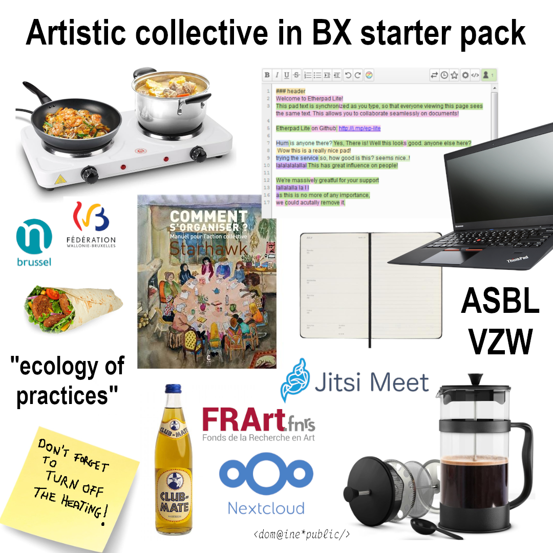 Artistic collective in Burxelles starter pack and there is: 2 cheap electric stoves with big casserole, an screenshot of an etherpad, a thinkpad, logo of VGC and FWB, the book how to organise by starhawk, an A5 notebook, ASBL/VZW, a durum, the term "ecology of practices", a club mate, jitsi and nextcloud, a french press full of coffee, FRART, domainepublic, and a post-it note that says don't forget to turn off the heating!