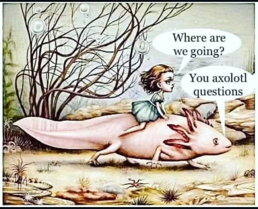 bikepunk @bikepunk@mastodon.tetaneutral.net · activity timestamp 2 weeks ago Original painting made by Mab Graveshttps://mabgraves.com/ Read more Read less Translate alt a girl riding an axolotl: -Where are we going? the axolotl: -You axolotl questions a girl riding an axolotl: -Where are we going? the axolotl: -You axolotl questions Reply Boost Quote pending approval Like More actions Copy link Flag this post Block
