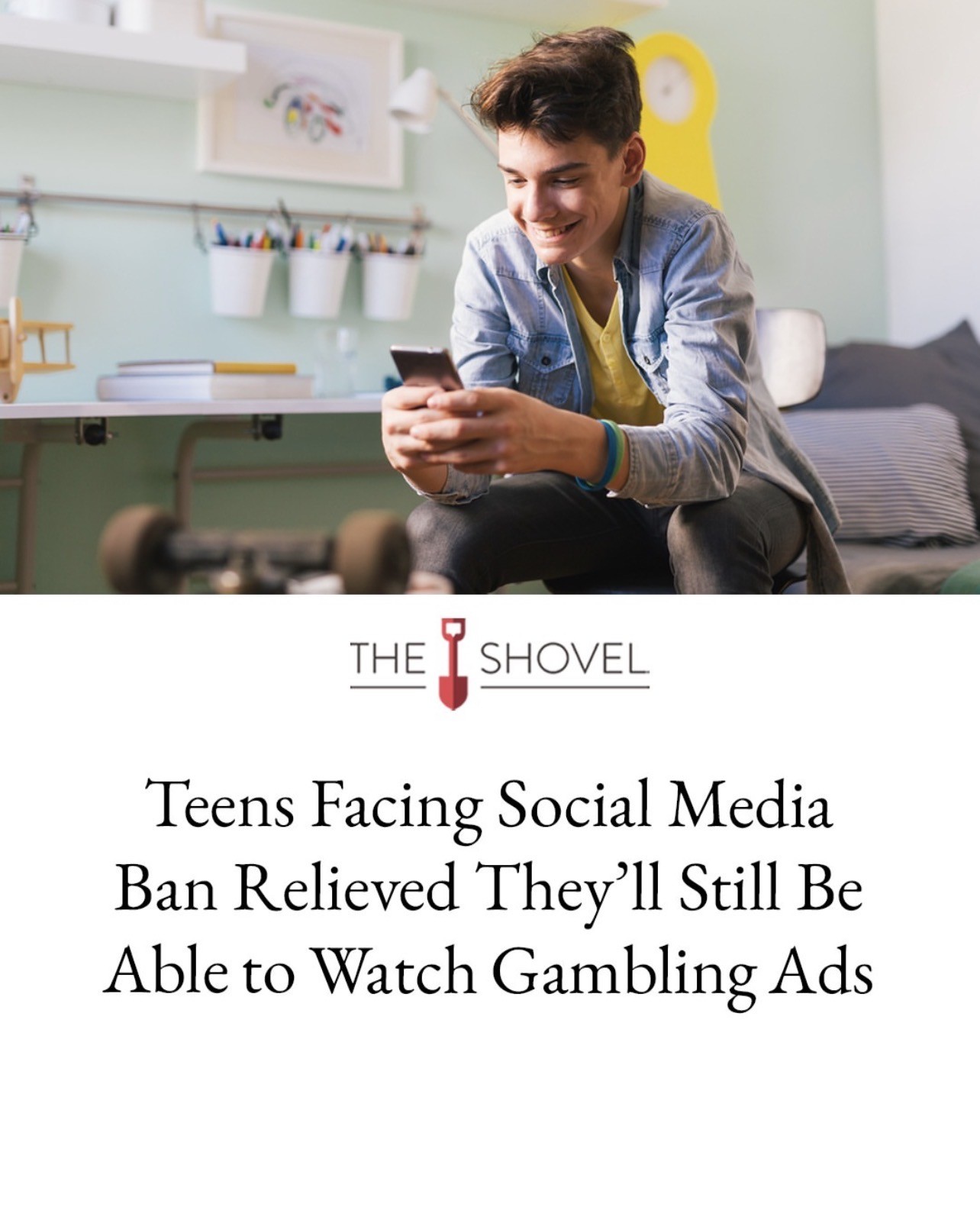 alt A young person smiling looking at their phone. Text: THE SHOVEL Teens Facing Social Media Ban Relieved They'll Still Be Able to Watch Gambling Ads A young person smiling looking at their phone. Text: THE SHOVEL Teens Facing Social Media Ban Relieved They'll Still Be Able to Watch Gambling Ads