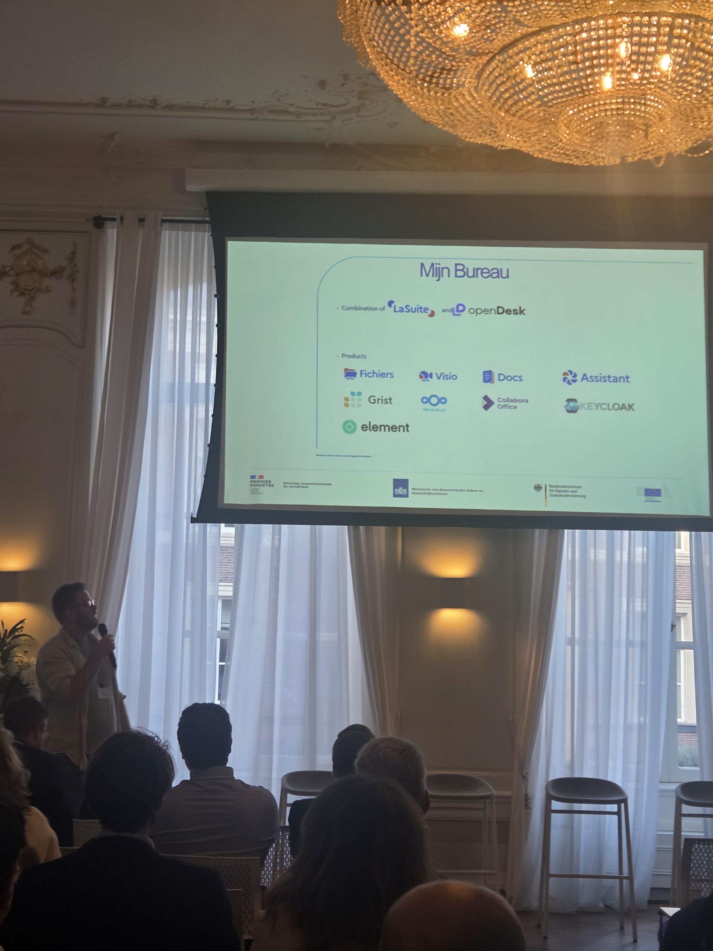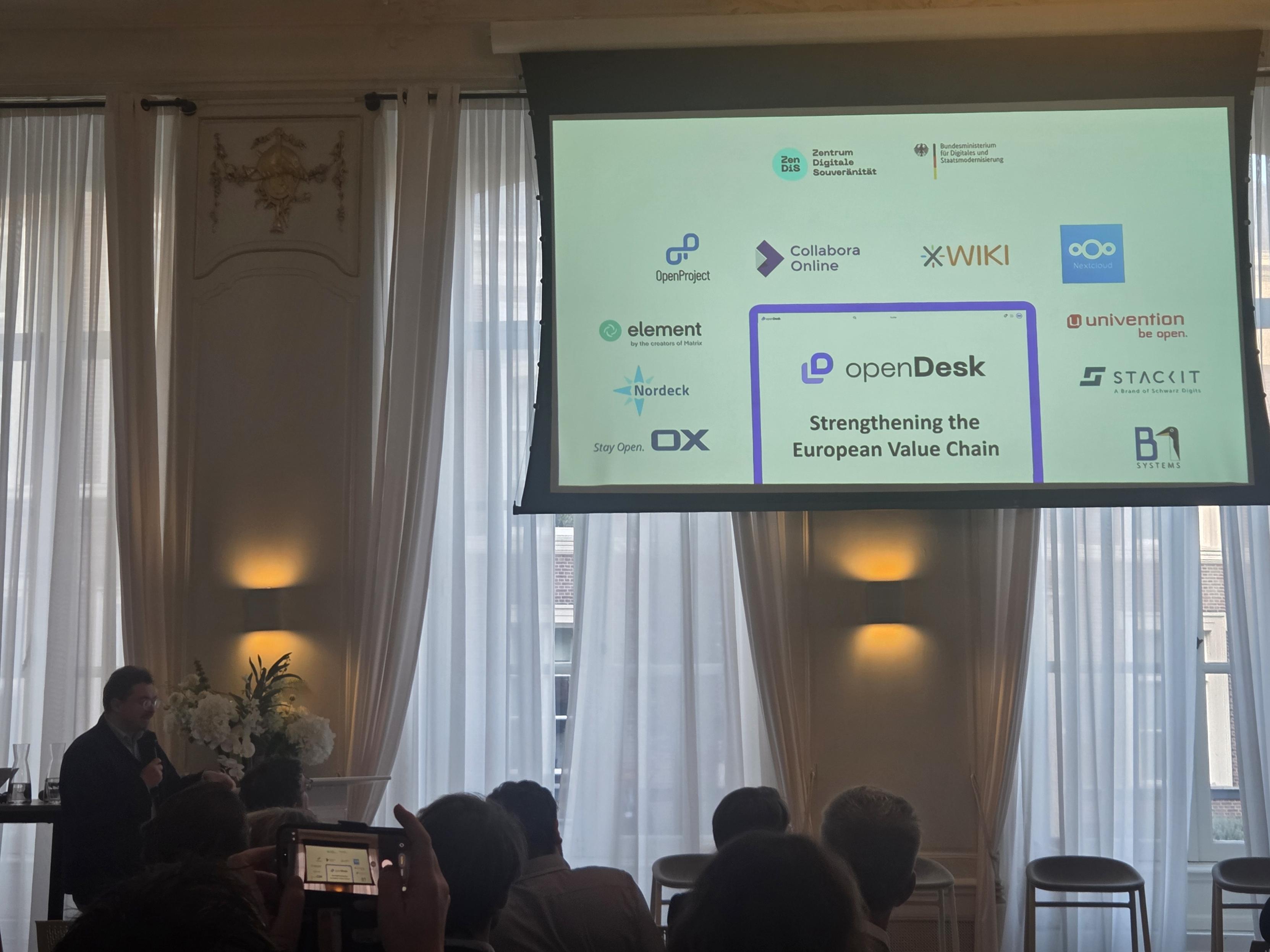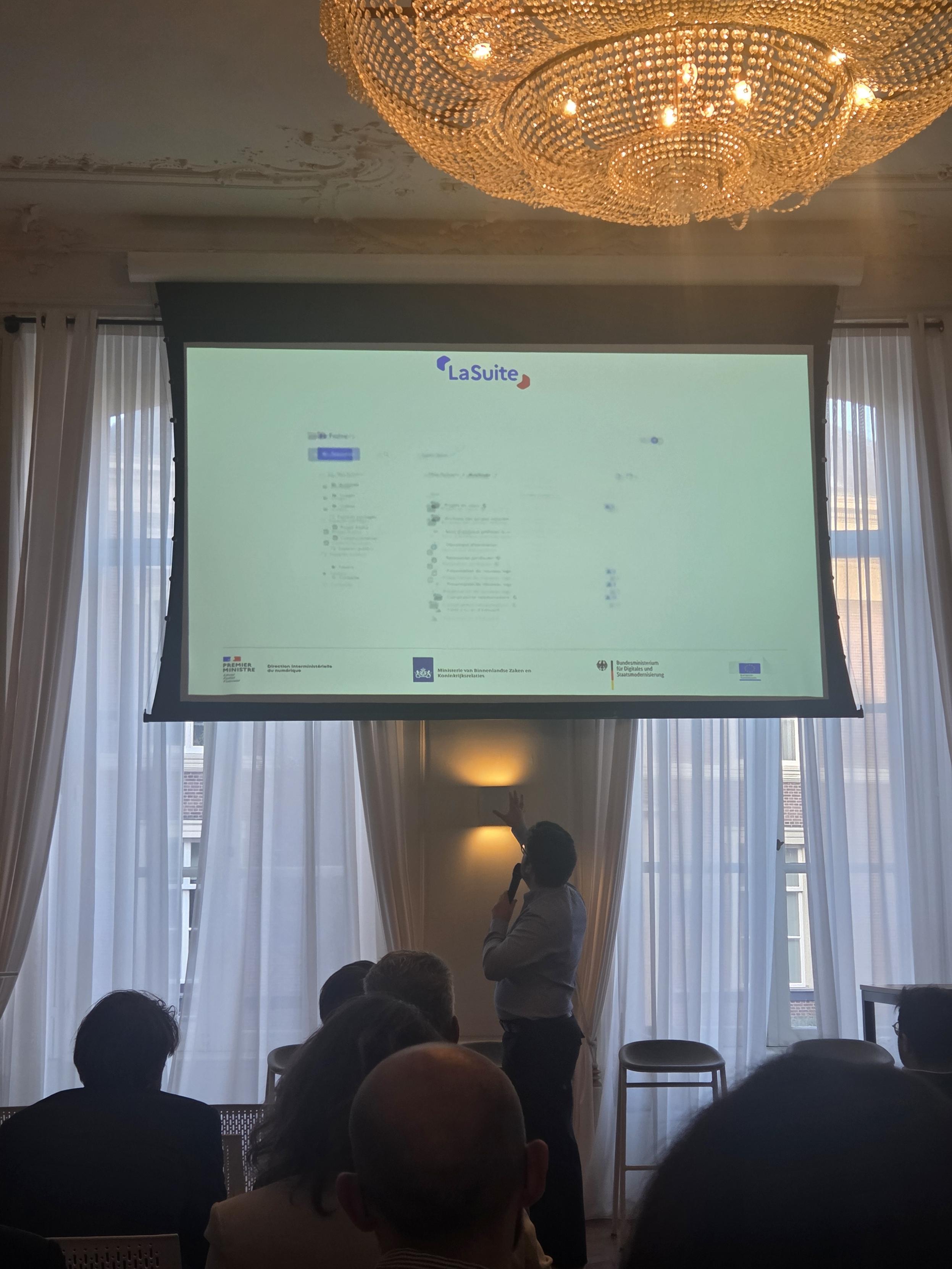 Celebratory moment with EU delegates from NL, Germany, France, Italy, Luxembourg, Poland, and Hungary on stage, holding balloons and receiving applause. In the background is a livestream of all participants that have joined our videoconference system (Visio, part of LaSuite)
