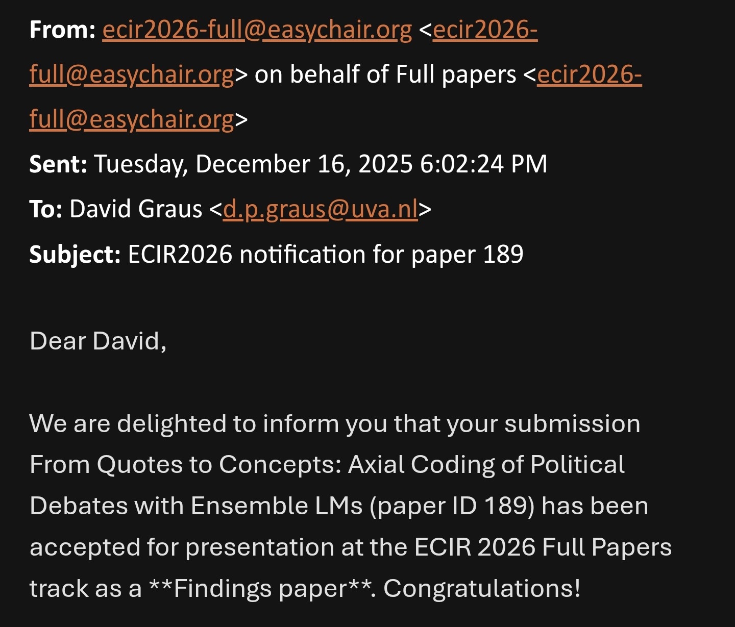 Woohoo! Paper accepted to Findings at @ecir2026.eu@bsky.brid.gy! 馃帀 We use LLMs for axial coding of political debates, work led by Angelina Parfenova (TU Munich), who I met at last year's ECIR in Lucca 馃嚠馃嚬 Love it when conference chats turn into papers! #ECIR2026 @opengov.nl@bsky.brid.gy