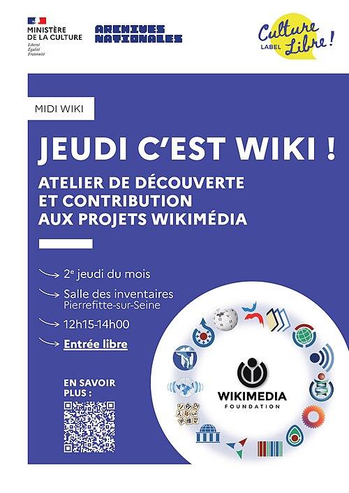 Affiche à dominante bleu, avec les logos Archives nationales, Label Culture libre et la galaxie des projets Wikimedia, titrant : Jeudi c'est wiki annonçant les midi wiki des Archives nationales