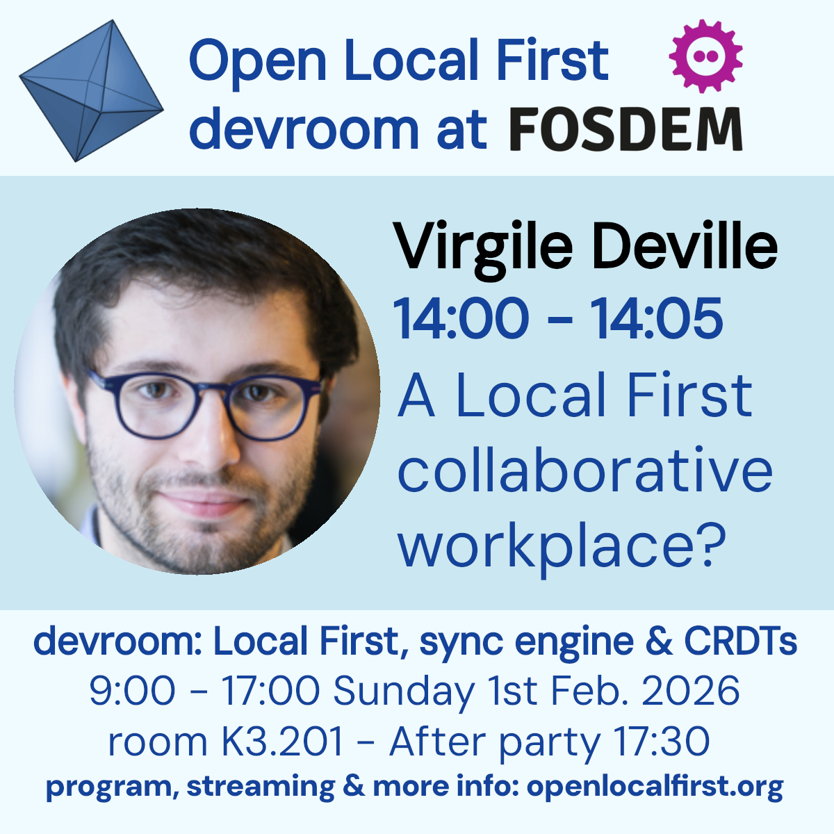 Virgille Deville @virdev from La Suite Numérique of @numerique_gouv will be talking about "A Local First collaborative workplace", at @fosdem '26 #LocalFirst & #CRDTs devroom!