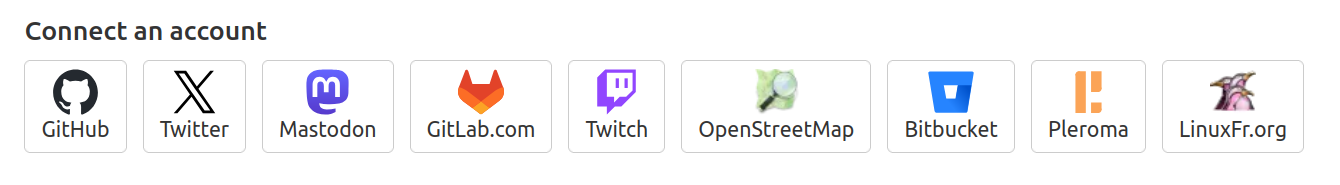 Connecting an account only supports Github, Twitter, Mastodon, Gitlab, Twitch, OpenStreetMap, Bitbucket, Pleroma, and LinuxFR.org