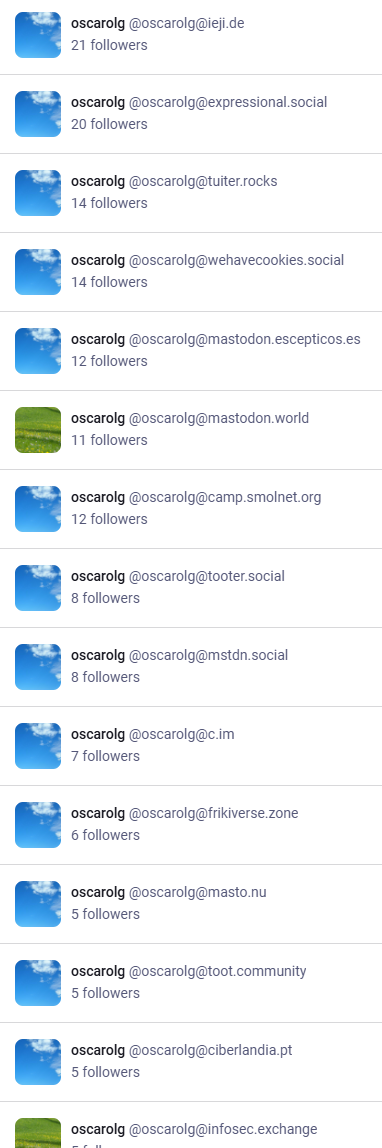 The account "oscarolg" continues to proliferate across federated services, with over 50 accounts observed today