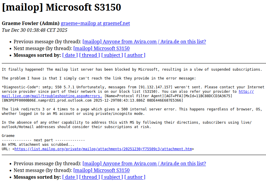 It finally happened! The mailop list server has been blocked by Microsoft, resulting in a slew of suspended subscriptions.