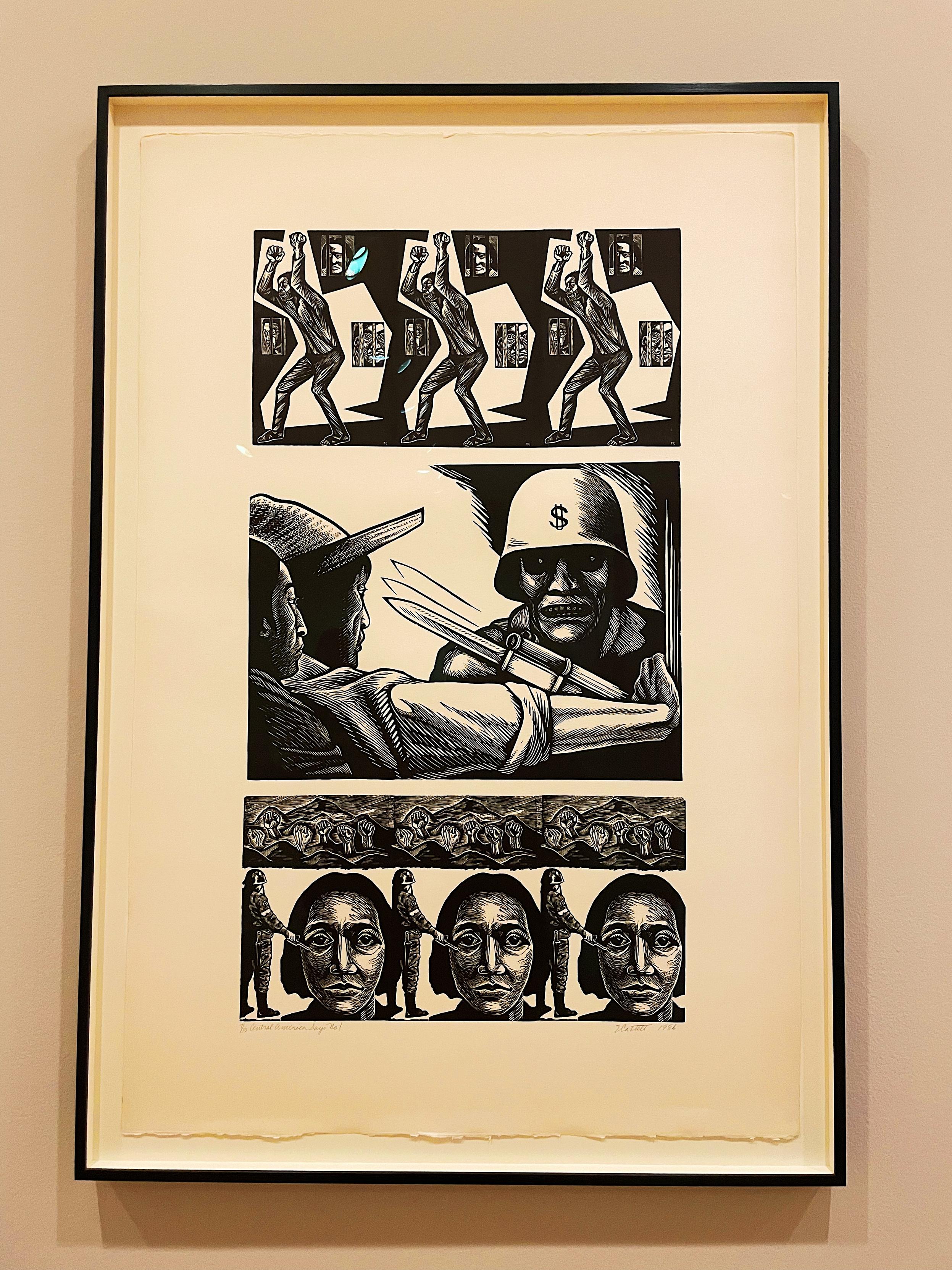 3 - "Central America Says No!" (1986), #linocut. Catlett repeatedly expressed outrage against #imperialism and US interventions around the world. This piece combines several printing blocks that Catlett used for earlier #prints. "Chile I" and "Chile Il" are powerful statements condemning the atrocities committed