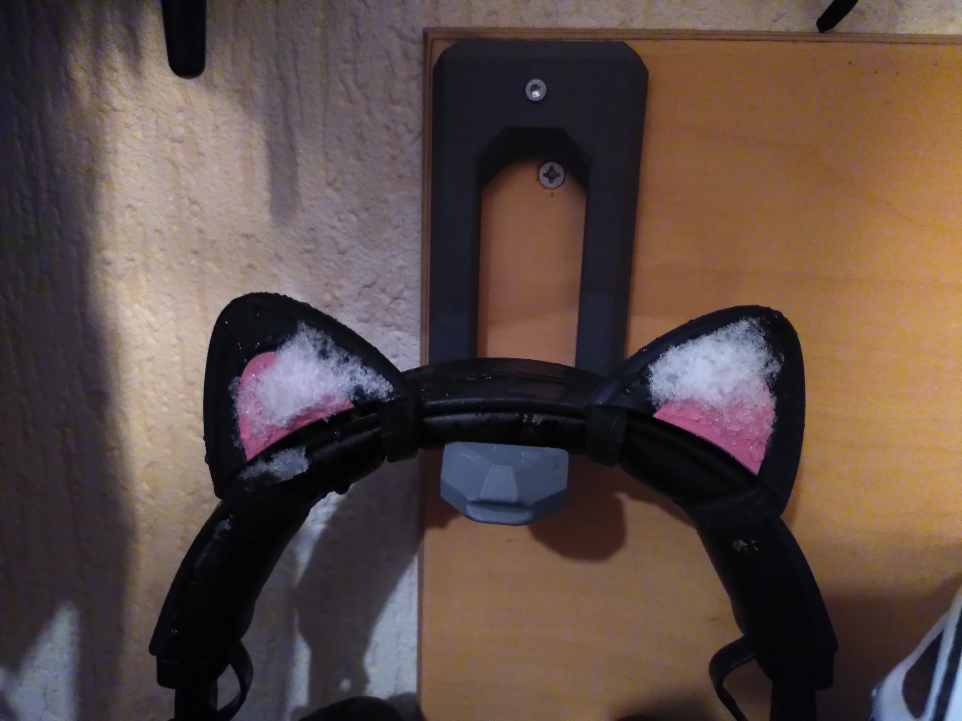alt A pair of fairphone fairbuds XL headphones on a 3d printed hook fixed to a peice of plywood. The headphones have a pair of black and pink cat ears attached. The ears have snow on them. A pair of fairphone fairbuds XL headphones on a 3d printed hook fixed to a peice of plywood. The headphones have a pair of black and pink cat ears attached. The ears have snow on them.